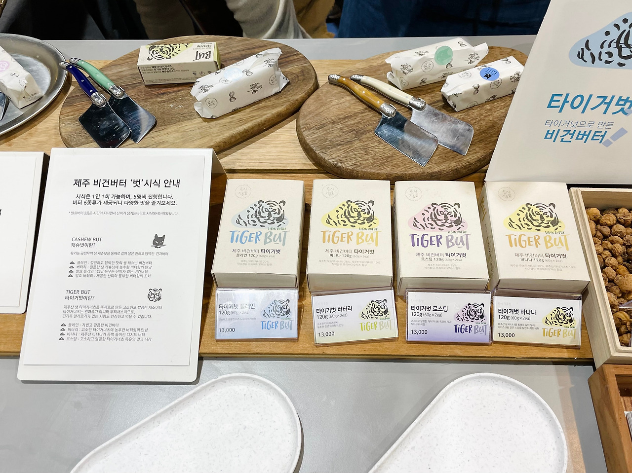 뭐라도 하나 사자는 마음으로 부스를 어슬렁거리는데 손님 셋이 모였으니 설명과 함께 시식을 해주겠다고 해서 얼떨결에 바로 맛을 보게 되었다. 비건 버터는 총 8가지 종류로 캐슈넛 라인과 제주산 타이거벗 라인으로 나누어져 있는데 발효 버터 2종을 제외하고 총 6가지의 맛을 보았다.