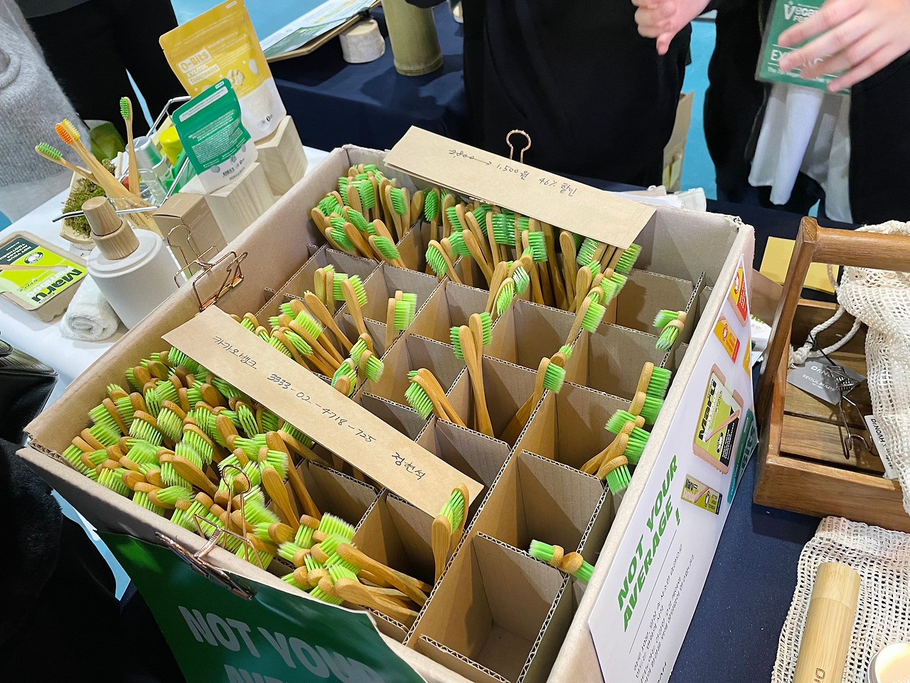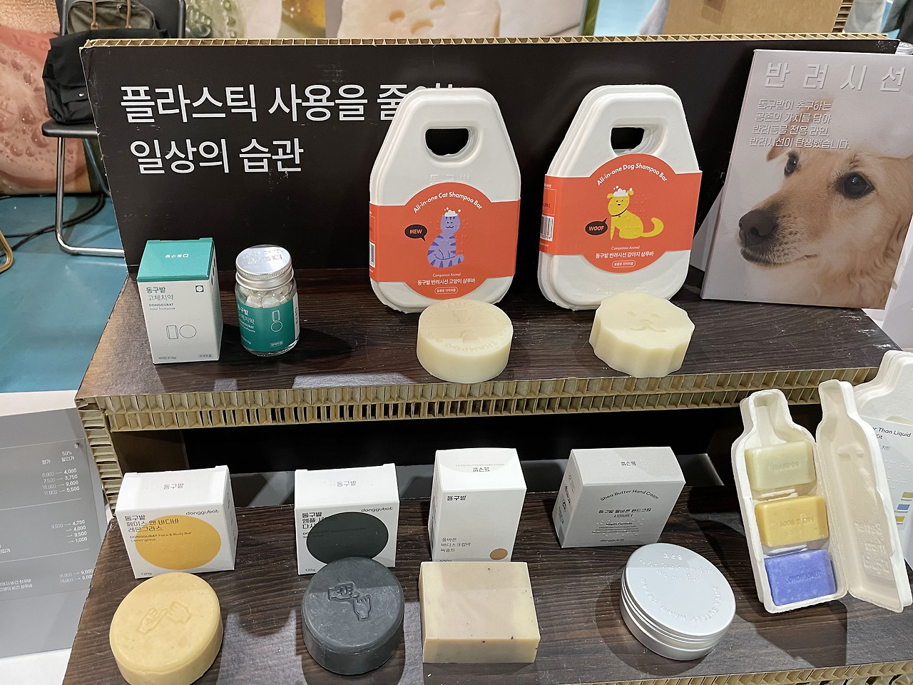 내가 찜해둔 부스는 '동구밭'과 '닥터노아'다. 친환경 라이프에 입문하면 가장 먼저 접하게 되는 기본 중의 기본이라고 할 수 있는 두 브랜드는 이미 내게는 정착템이자 쟁여템이다. 할인 중인 대나무 칫솔을 무포장으로 구매하고 리뉴얼 이전 버전의 고체 치약도 매우 저렴하게 구매했다. 동구밭에서는 곧 여행 가는 엄마를 위한 여행용 비누 키트와 평소 비싸서 망설였던 다시마 앰플 세안바를 할인가에 구매했다.