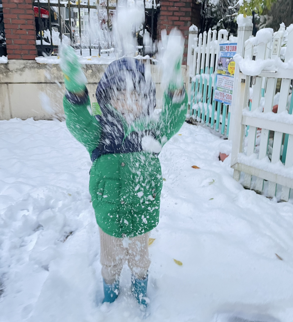 나의 자유로운 영혼을 가진 다섯 살 아들은 따뜻하고 깨끗한 새 헌 부츠를 신고 눈 위를 마음껏 굴러다녔다. 토끼처럼 콩콩 뛰다가 강아지처럼 눈밭을 구르고 그러다 아예 누워버렸다. 순수하게 눈을 좋아하는 아이의 모습이 너무 귀여워 옷이 어떻게 되든 이 시간을 만끽할 수 있도록 내버려두었다.