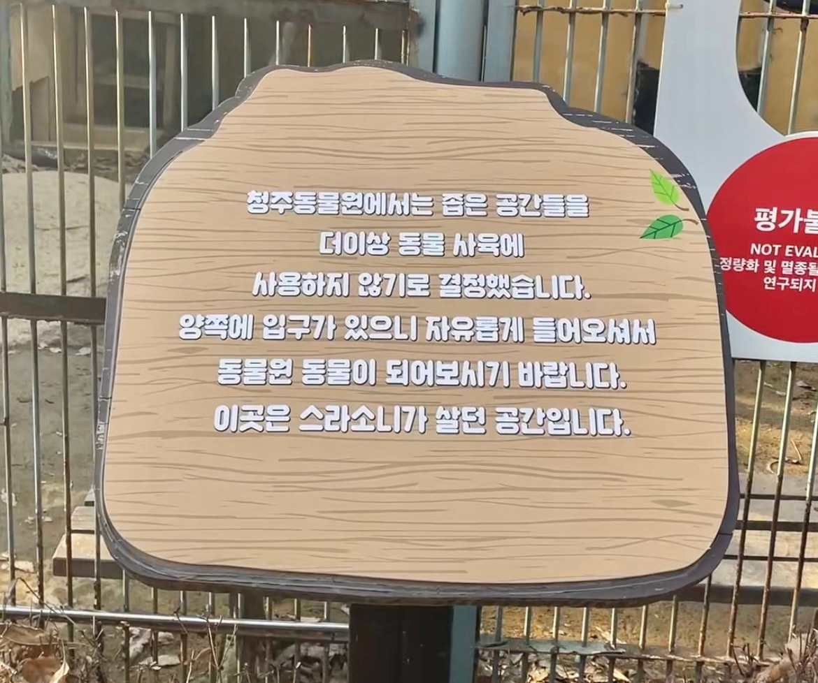 가장 인상적이었던 곳은 과거 스라소니가 머물던 좁은 공간. 청주동물원에서는 더 이상 좁은 공간에서 동물들을 사육하지 않기로 결정했기에 해당 동물사를 비워두었다. 대신 방문객들이 직접 들어가 동물의 입장이 되어 체험해 볼 수 있는 체험 공간으로 변신했다. 사람 역시 동물의 한 종류로 분류되어 좁은 공간에 갇혀서 누군가의 구경거리가 되어야 한다면 어떨까. 견딜 수 있을까.