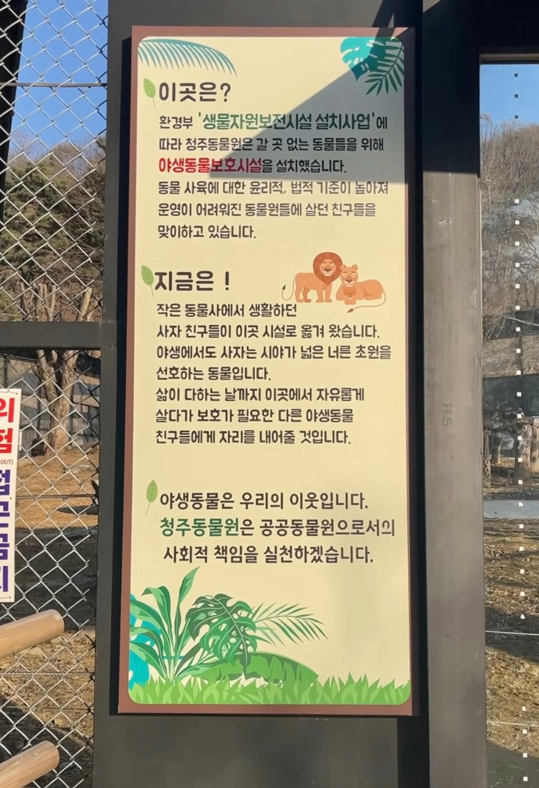 최소한의 동물 복지도 보장되지 않는 다른 동물원의 야생동물들을 데려와 보호시설을 자처하는 곳. 청주동물원의 동물들 역시 서식지로 돌아가 푸른 초원에서 사는 환경이라고 말할 수는 없지만 열악한 환경에서 살아가는 동물들이 머물 수 있는 보호소가 되어주고 있다는 점은 긍정적으로 보였다.