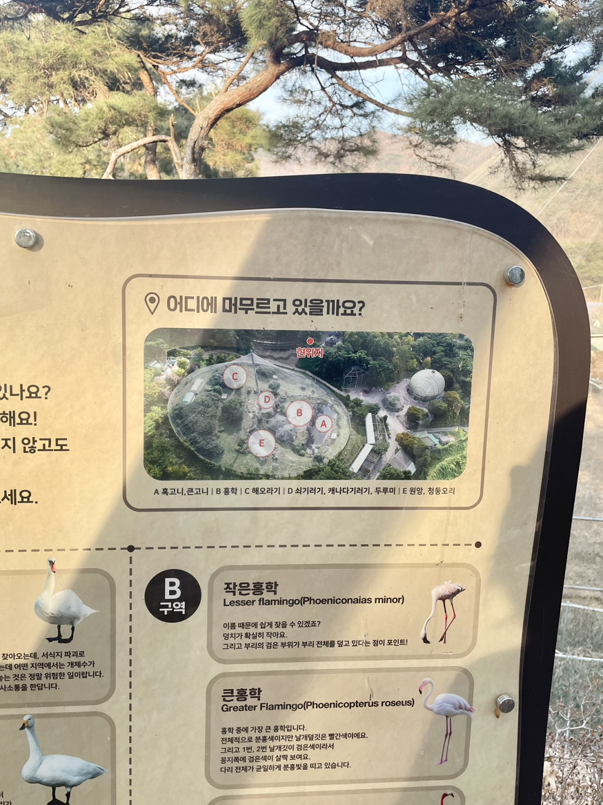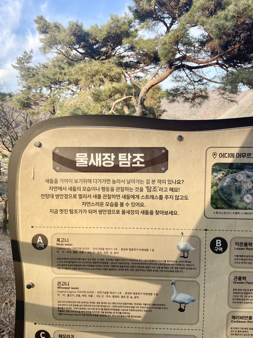 포유류들을 모두 보고 긴 데크로 된 길을 지나니 거대한 탐조장이 나왔다. 바로 새들이 머무는 공간이었다. 흙과 연못, 나무가 자라는 언덕에 다양한 종류의 새들이 모여있었다. 하늘을 날아다니는 새들에겐 최소한 이 정도의 공간은 있어야 하지 않을까. 맨 위쪽에 구멍이 있는 건지 많은 까치들이 들어갔다 나갔다 하는 모습이었다. 좁은 공간에 있는 새들을 구경하며 스트레스 주는 게 아니라 한 발짝 멀리 떨어져 지켜보는 탐조. 이곳은 탐조를 하는 곳이었다.
