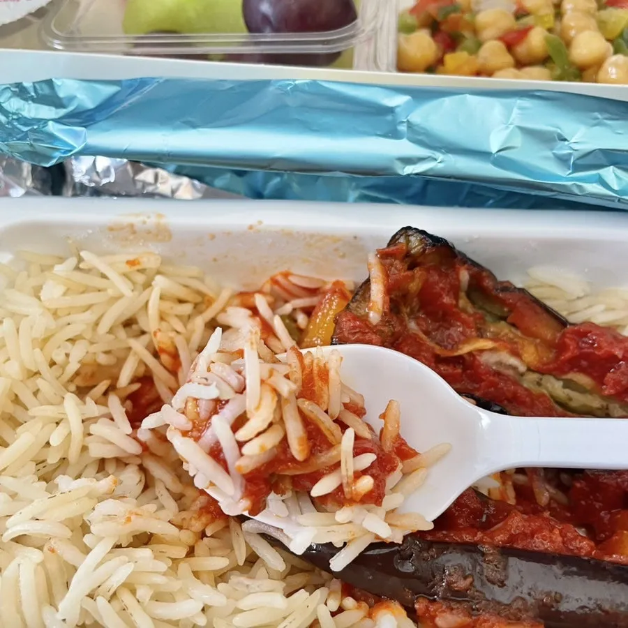 플라스틱 용기에 담긴 메인 메뉴와 종이 상자에 디저트 두 가지, 그리고 생수가 들어있었다. 역시 쓰레기가 많이 나왔다. 평소에 배달 음식도 안 먹고 일회용기는 되도록 안 쓰는 편이라 이런 플라스틱 용기에 든 음식은 참 오랜만에 먹어본다. 그동안 안 쓴 일회용품 비행기 위에서 다 쓰는 기분이 들었다. 특히나 텀블러도 있는데 생수를 담은 작은 페트 컵은 너무나 아깝다는 생각이 들었다.
