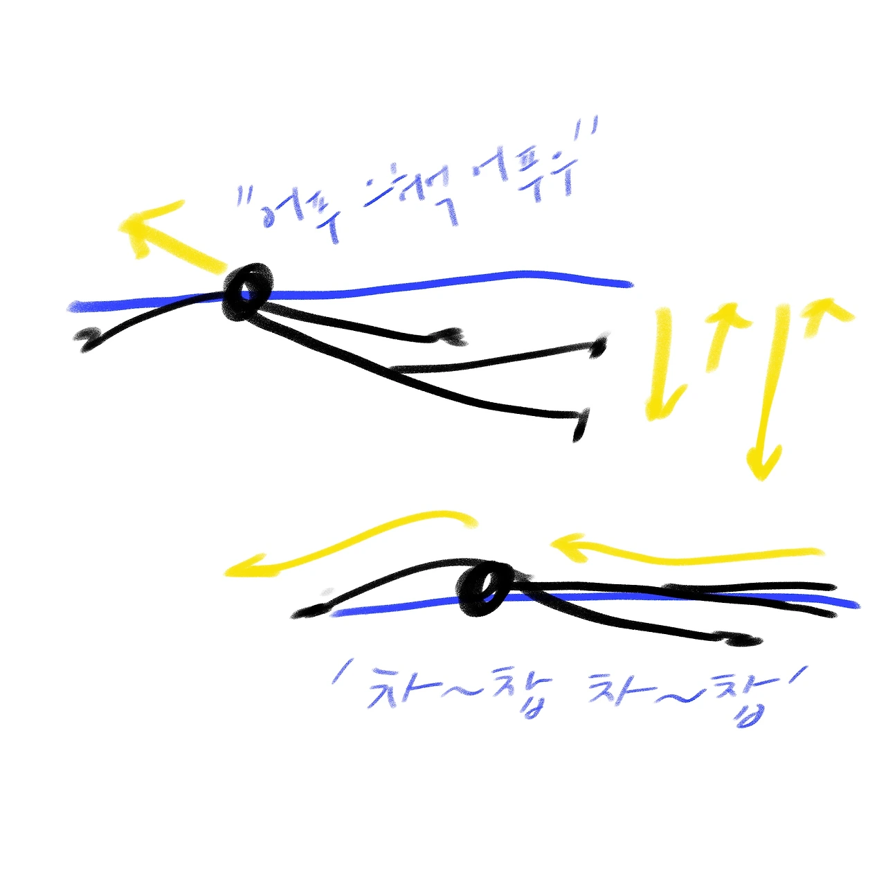 몸에 힘이 남아도니 몸이 근질거렸다. 그러니까 몸이 신경써야 할 부분이 줄어드니 다른 무언가에 신경을 쏟을 힘이 생긴 것이다. 때마침 강사가 수업시간에 ‘몸을 회전시키며 팔을 뻗는’ 롤링을 가르쳐주었다. 한 쪽 팔을 젓고나서 물 위를 스쳐지나가 물 속으로 뻗을 때, 머리는 고정시키고 몸을 회전시켜 어깨를 조금 더 앞으로 빼내어 물을 가르며 나아간다. 어깨가 뻗는 힘에 따라 몸이 조금 더 앞으로 나아가는 느낌은 인간의 본능을 자극한다. 사람은 앞으로 잘 걸어나가길 바라니까. 뒷걸음질보다는 앞으로 길게 뻗는 추진력에 조금 더 믿음을 두고, 본능적으로 우선하기 마련이니까. 이 롤링이 무엇보다 중요한 건 ‘차~찹 차~찹’ 물을 가르는 리듬을 생성시켜주기 때문이다.