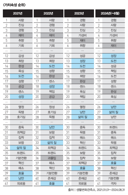 ‘재미’, ‘경험’, ‘성장’, ‘낭만’, ‘효율’, ‘삶의 질’은 뚜렷하지만,