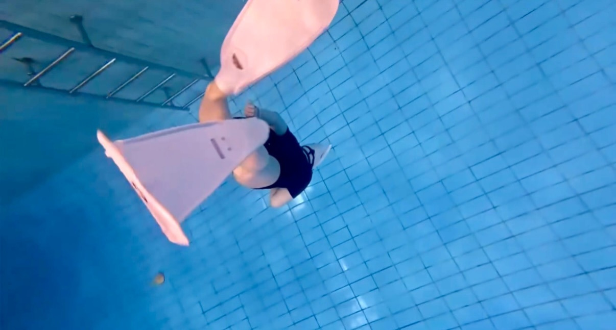 - 핀이 완전히 물속에 잠긴 것을 확인한 뒤, 다리로 피닝(발차기)을 시작해 내려간다. 물 밖에서 발차기를 하면 힘만 낭비되므로 반드시 핀이 잠긴 뒤에 시작한다.
