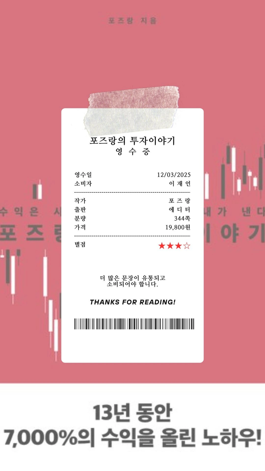 그럼에도 완독을 이끈 원동력이 있다면, 부자의 마인드셋을 배울 수 있는 책이라는 확신이 들어서였다. 그리고 솔직해서 였다. (다만 좀 잔소리같은 부분도 있..) 투자의 고수나 천재라는 수식이 붙는 누군가의 눈부신 투자의 성과만을 부러워하기 쉽다. 하지만 물밑에서 그들이 꾸준하게 공부하고, 숙려하고, 마음고생을 하는 이야기에는 크게 관심을 두지 않는 것 같다. 십 여년을 전업투자자로 꾸준한 성과를 내고 있는 저자의 일상을 들여다 볼 수 있어 좋았다.