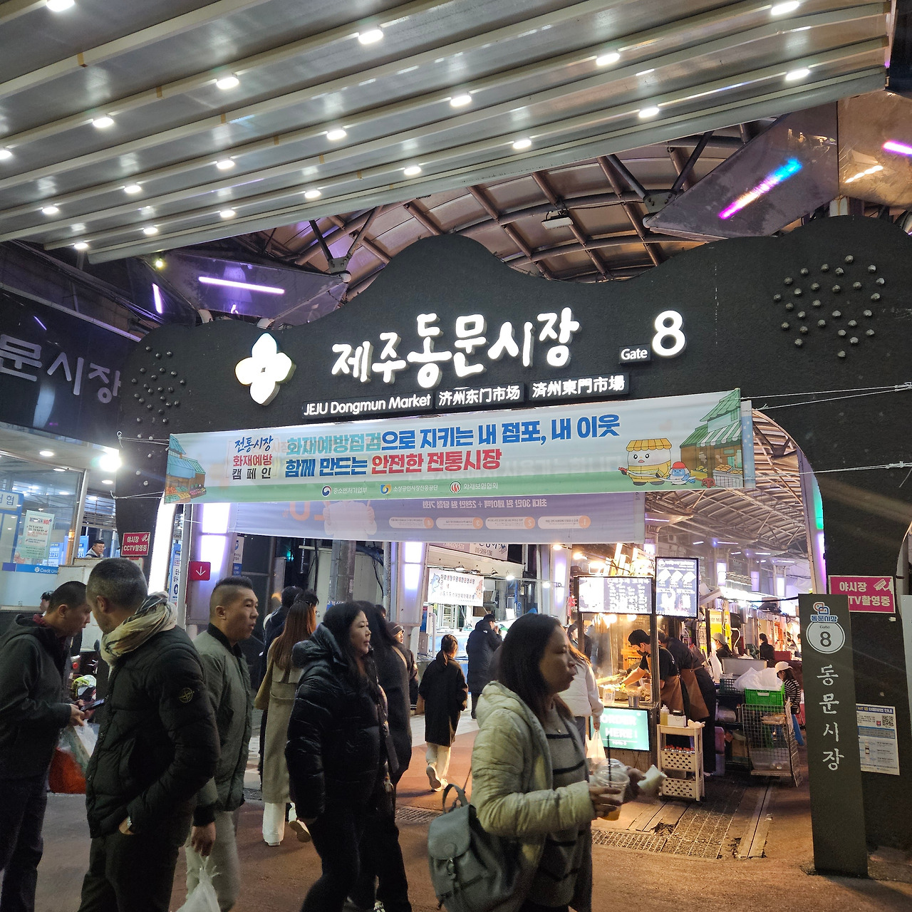 제주시에서 가장 대표적인 야시장인 동문시장. 늦은 시간에도 불이 꺼지지 않는다.