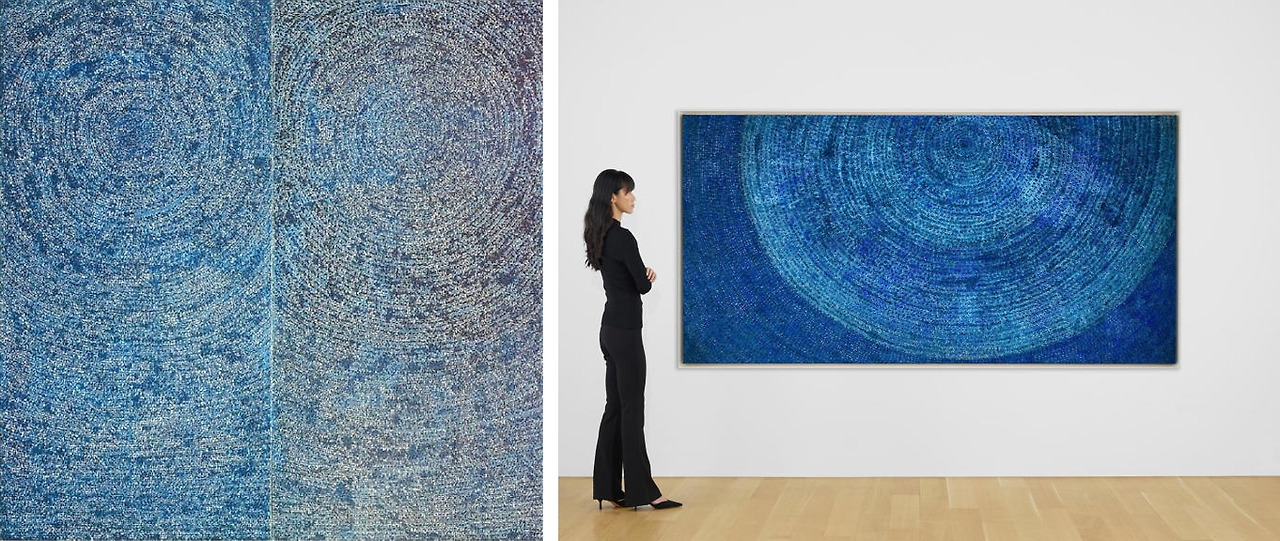 캔버스 대신 코튼(면)을 사용하여 마치 화선지에 먹이 번지듯 수십만개의 점이 자연스럽게 번지도록 하였다.