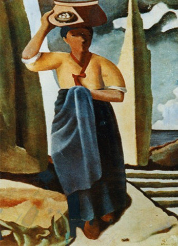 위의 작품은 1935년작 <종달새 노래할 때>이다. 작가가 ‘처녀작’으로 부르는 이 작품으로 그는 대회 입선의 영광을 안고 비로소 화가가 된다. 작품을 보면 얼굴이나 배경의 디테일은 생략되었는데 큐비즘의 영향으로 볼 수 있다. 바구니의 알을 그대로 보여주는 표현은 지금 보아도 파격적이다.