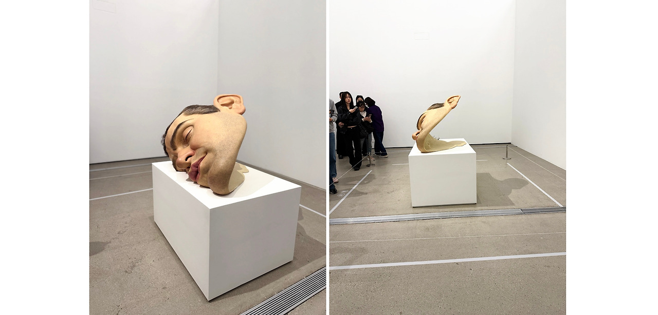 기다란 속눈썹, 막 자라난 듯한 수염이 보이는 모공, 도톰하고 커다란 입술, 수평으로 누운 코 선, 꿈꾸는 듯한 미간, 모세혈관이 터질 듯한 이마…. 누군가를 이토록 세밀하게 관찰한 적이 있을까 싶었다. 얼핏 보아도 강렬한 인상을 남기는 얼굴은 이 작품이 실제의 4배 크기로 제작되었기에 세밀한 관찰이 쉬워진다. 감정의 진폭도 확대한 만큼 커진다.