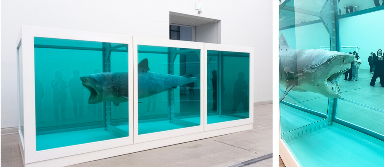 푸른 바다를 유영하는 듯 보이는 상어는 사실 포름알데히드 용액이 담긴 수조에 보존된 사체이다. 고정된 죽음이, 커다랗게 입을 벌린 채 관객 앞에 놓여 있다.