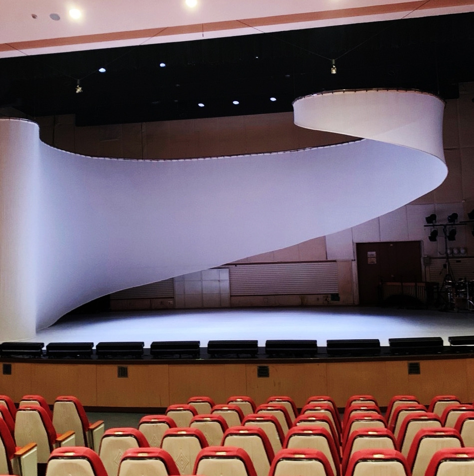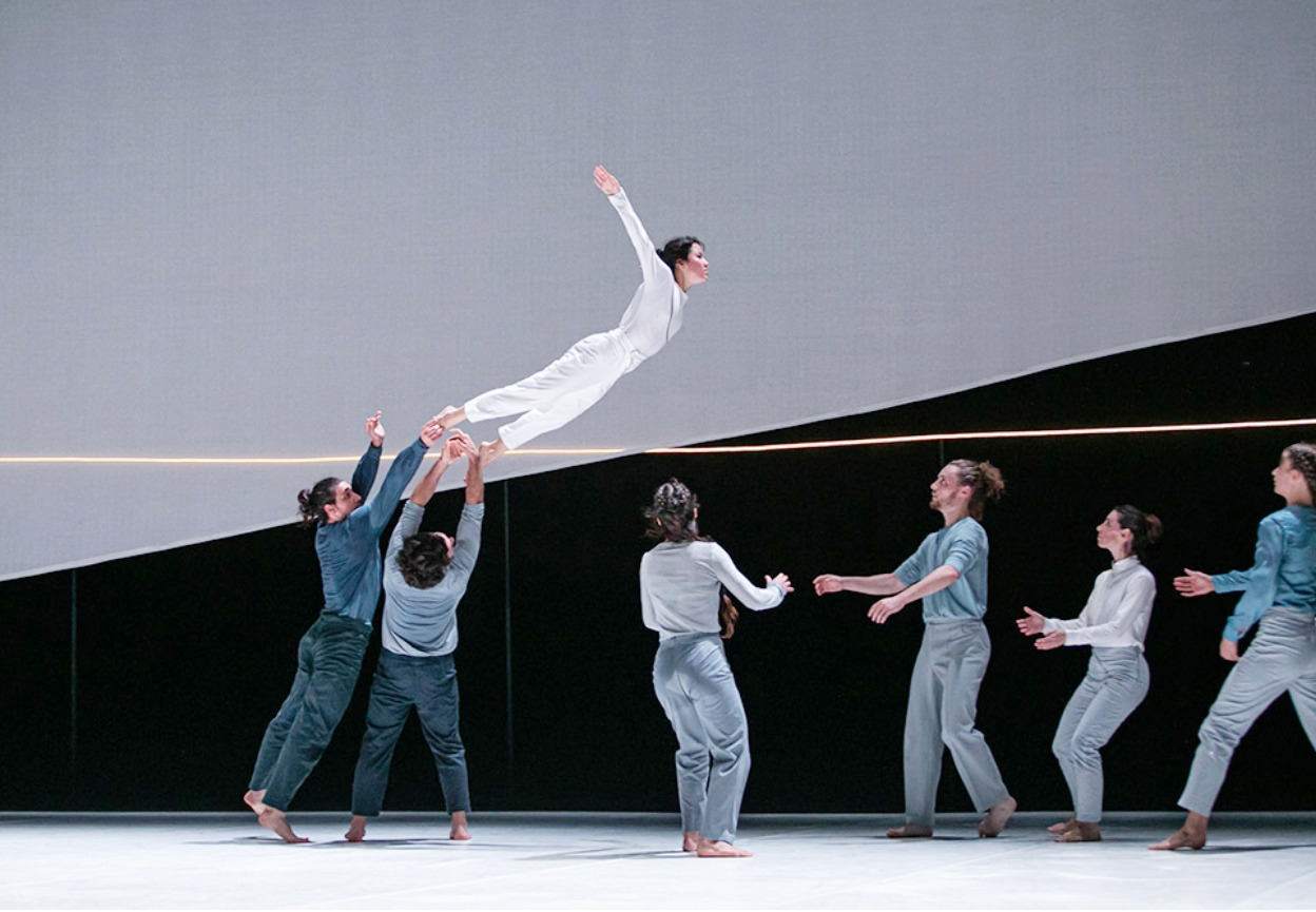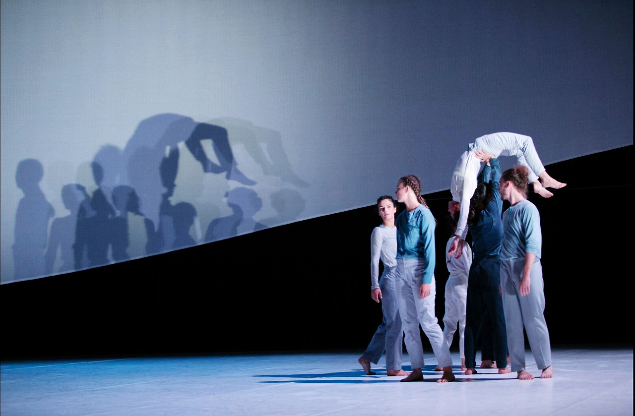 무대에는 흰 스크린이 나선형으로 드리워져 있다. 마치 연속되는 물결과 미로의 한 부분을 상기시킨다. 댄서들이 스크린 뒤에서 등장하면 마치 시간의 밖에서 안으로 들어오는 것 같다. 이것은 시간의 겹이 되어 댄서들의 그림자를 투영하기도 한다(아래 사진).
