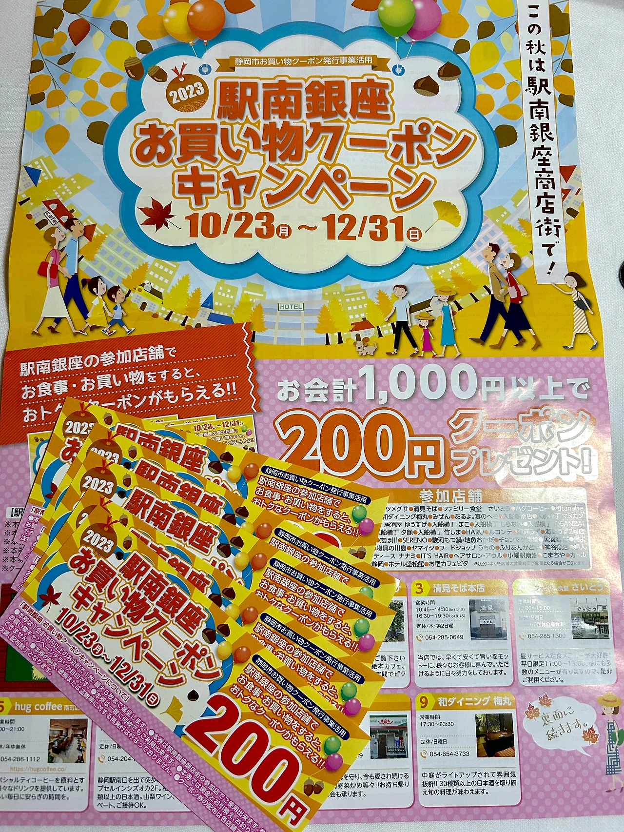 숙소에 체크인할 때 카운터에서 받은 에키미나미긴자(駅南銀座) 쇼핑 쿠폰. 시즈오카역 기준으로 남쪽에 있는 상점가들에서 사용할 수 있는 쿠폰이었다. 아마 백화점이나 상점가가 있어 번화한 북쪽에 비해 상대적으로 사람들이 덜 몰리는 남쪽의 활성화를 위한 캠페인이 아닌가 싶다. 쿠폰을 꼭 사용하지 않더라도 어떤 가게가 있는지 전단지와 구글을 통해 열심히 찾았다. 오늘 저녁은 에키미나미긴자다.