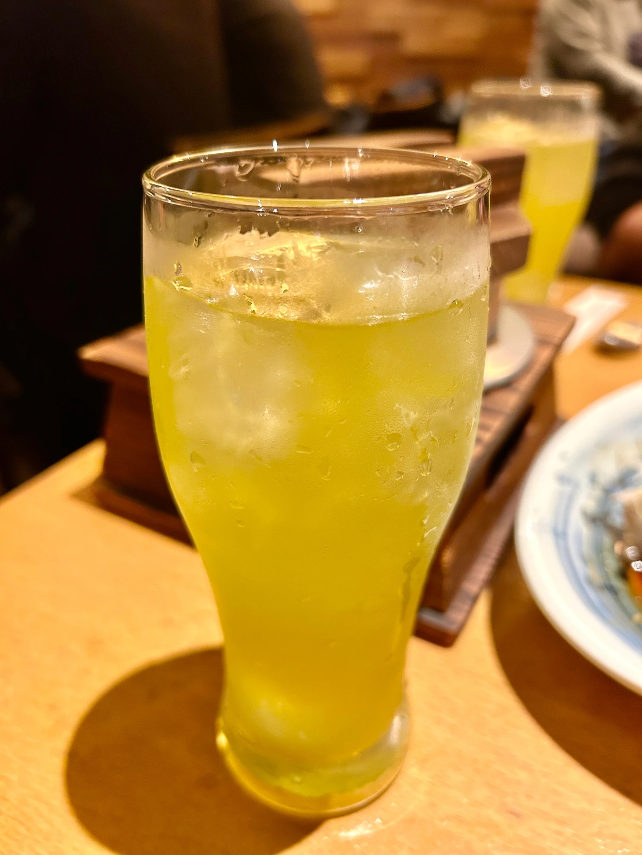 짝꿍과 둘이서 이런저런 이야기를 하고 있을 때 즈음 테이블로 찾아온 우리의 새 친구. 본인이 주는 서비스라며 건네주고 간 녹차와리(緑茶割り) 두 잔. 큰 선물이 주고 간 깜짝 선물이다. 일본에서 일할 때 가게에서 드링크 메뉴를 만들었던 경험이 있는 짝꿍은 바로 알아봤고, 그런 경험이 없던 나는 실제로 보는 것도 처음이었던 녹차와리. 녹차의 고장 시즈오카에서 마시는 생애 첫 녹차와리라니. 정말 즐거운 저녁이 아닐 수 없다.