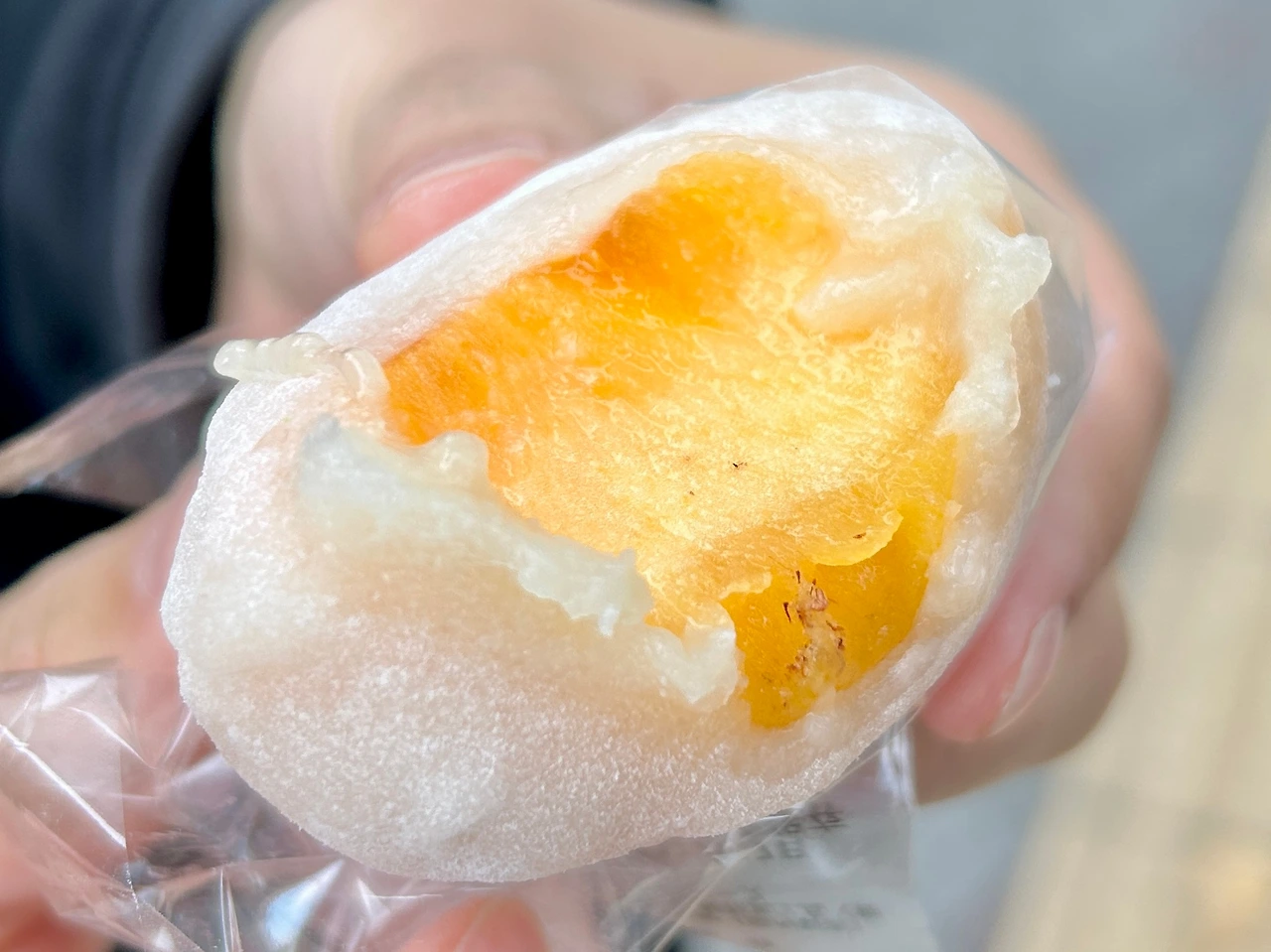 다이후쿠(大福)라고 하면 보통 팥이 들어간 찹쌀떡으로 화과자의 한 종류다. 다이후쿠의 종류는 무척 다양하겠지만 그중 우리나라 사람들에게도 꽤 유명한 건 딸기가 들어간 다이후쿠가 아닐까. 숙소 근처에 벤자이텐(弁才天)이라는 후르츠다이후쿠(ルーツ大福)로 유명한 가게가 하나 있었다. 평소라면 거들떠보지도 않을 후르츠 다이후쿠인데. 기간 한정으로 감이 들어간 다이후쿠 사진이 붙어있는 것을 보고 나도 짝꿍도 홀린 듯 들어가고 말았다.