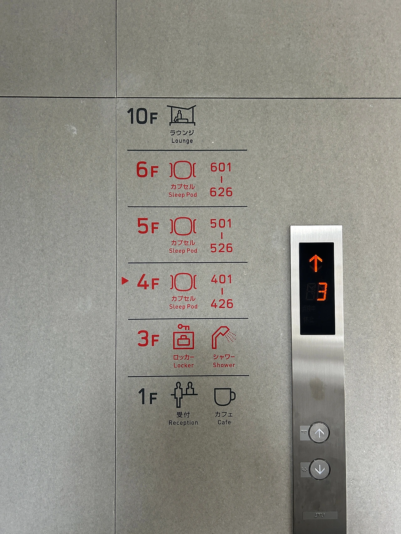 1층은 리셉션 겸 카페. 2층에는 남성 전용 샤워룸과 락커룸, 3층에는 여성 전용 샤워룸과 락커룸. 4층부터 6층까지는 여성 전용 룸, 7층부터 9층까지는 남성 전용 룸. 10층은 라운지. 이렇게 총 10층으로 구성된 단독 건물이라 역에서 찾아오는 것도 어렵지 않았다. 여성과 남성이 사용할 수 있는 공간이 아예 층으로 분리되어 있고 그래서인지 애초에 엘리베이터부터 따로 탑승하도록 되어있다. 해당 층의 카드키가 아니면 엘리베이터 자체를 탑승할 수 없는 구조.