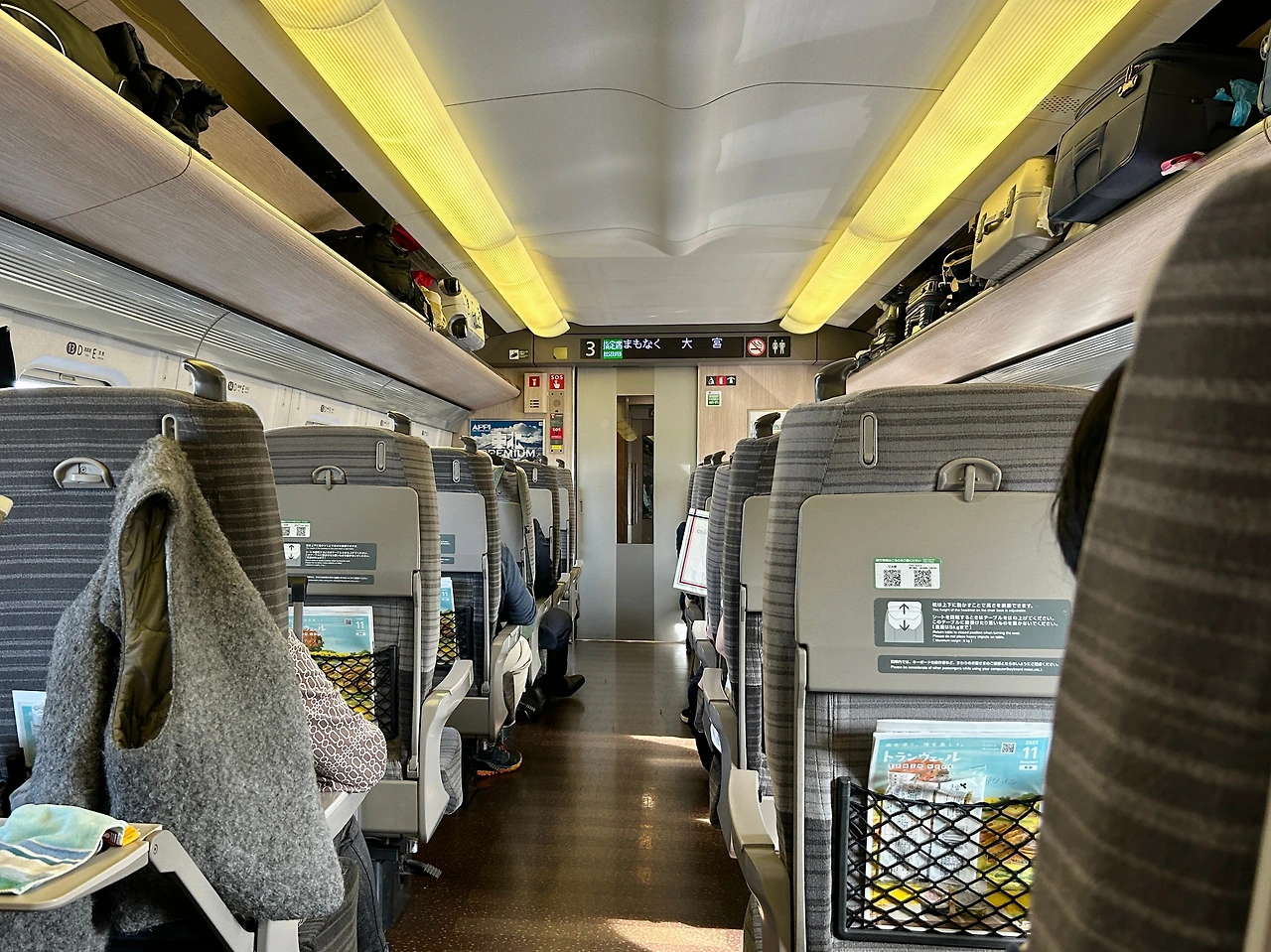생각했던 것보다 훨씬 넓고 쾌적했던 하야부사의 내부. 좌석도 넓고 벽면부터 조명까지 전체적으로 밝아서 답답하지 않았다. 4시간을 가야 하는데 괜찮을까 했던 걱정이 사르르 녹을 정도로 좋았다. 아마 앞으로 타고 다닐 기차들 중 얘가 가장 좋지 않을까? 이런 좋은 기차는 처음이자 마지막인가? 하며 우스갯소리를 했던 기억.