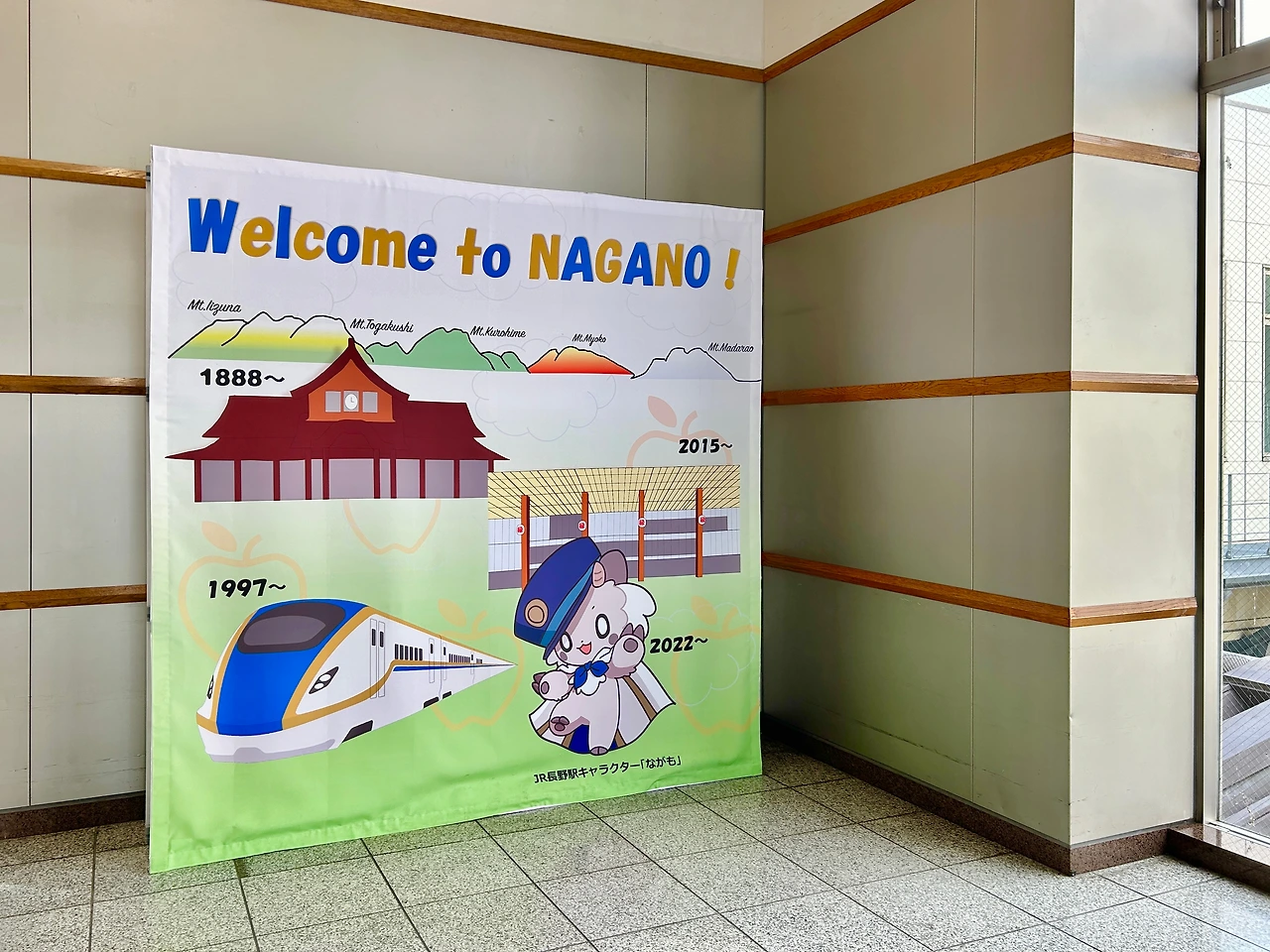 처음 나가노역이 생겼던 1888년의 불각(佛閣) 모양의 역사(驛舍)는 신칸센 개통으로 중축하면서 사라졌다고 한다. 호쿠리쿠신칸센(北陸新幹線)은 1998년에 열리는 나가노 동계 올림픽에 맞춰 1997년에 개통되었고, 새로운 노선의 호쿠리쿠신칸센의 개통에 맞춰 예전 불각 모양의 역사를 원하는 일부 의견을 반영해 처마와 나무 열주(列柱)가 있는 역사로 재건축된 것이 2015년. 나가노역의 유루캬라(ゆるキャラ)인 일본산양 캐릭터 나가모(ながも)는 2022년에 선정되었다고 한다. 짧고 간단한 역사의 역사.