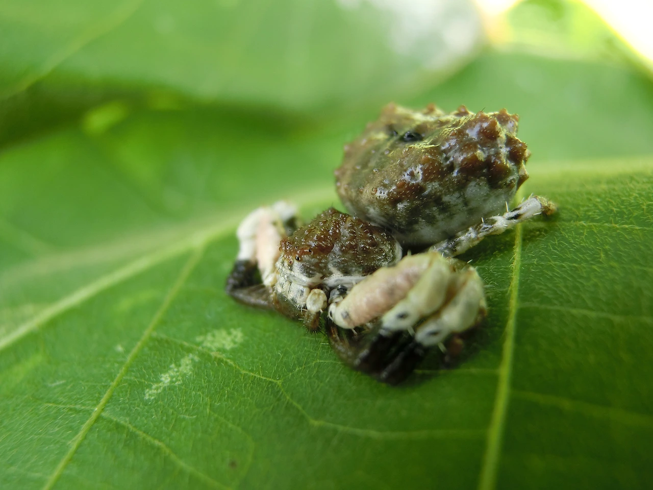 사마귀게거미는 바구미과 곤충들처럼 새똥을 닮은 거미입니다. 주로 숲 속에서 나뭇잎 위에서 정지한 채 쉬고 있는 모습을 볼 수 있는데 그 모습이 멀리서 보면 새똥과 매우 흡사하지요. 바구미과 곤충들이 새똥 모양을 흉내 내는 것은 천적의 위협을 피하기 위한 생존의 지혜입니다. 마찬가지로 사마귀거미도 주변에 도사리고 있는 천적들의 눈을 피하기 위해 이렇게 새똥과 비슷한 모습으로 진화를 해왔을 것으로 추정됩니다. 멀리서 보면 새똥처럼 보이지만 가까이서 관찰해보면 새똥 보다는 초콜릿을 온몸에 바른듯한 모습에 가깝습니다. 녀석의 이름이 사마귀게거미인 것은 몸 구석구석에 사마귀 돌기가 흩어져 있기 때문입니다. 제목에서도 밝힌 바와 같이 사마귀게거미는 세계적으로도 매우 희귀한 거미이기 때문에 아직까지 밝혀진 것이 거의 없는 거미라고 할 수 있습니다.