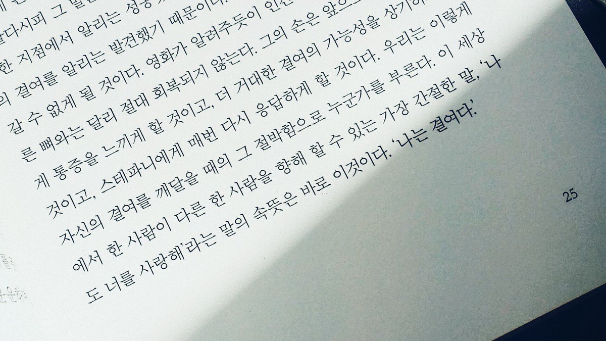 그런데 “타인의 사랑이 내가 나를 더 사랑하게 만드는 것이 아니라 내 안에 결여를 인지하도록 이끄는 것, 바로 이것이 나로 하여금 타인의 사랑에 응답하게 만드는 하나의 조건이 된다(P.20”)면, 이것은 그리 로맨틱한 상황은 아니라고 나는 생각한다. 즉 사랑은 나의 결여를 인지하게까지 만드는 것. 나를 코너까지 몰고 완전히 뒤흔드는 것. 어떤 의미에서는 폭력적인 것.