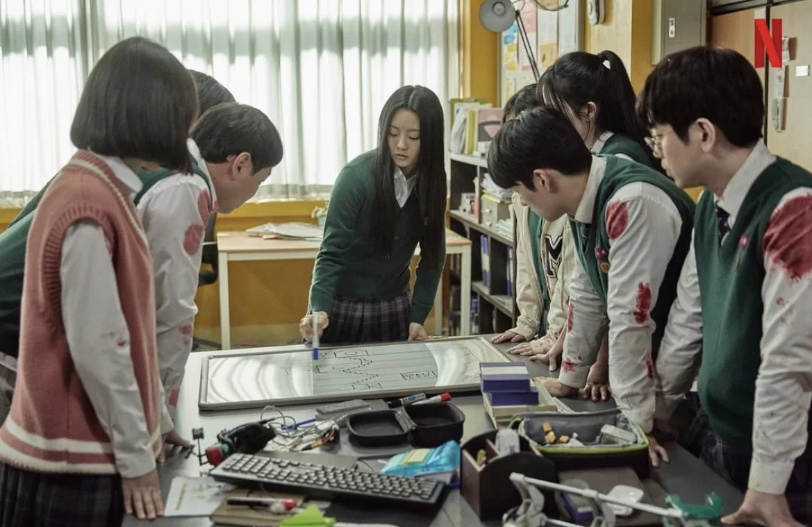 <지금 우리 학교는>의 배경은 일단은 학교입니다. ‘일단은 학교’인 이유는 드라마의 공간적 배경이 효산 고등학교에서 효산시 전체로 점차 확장되기 때문입니다. 좀비와 바이러스는 학교에서 도시 전체로 시점을 이동시키는 교량 역할을 하는 것입니다.