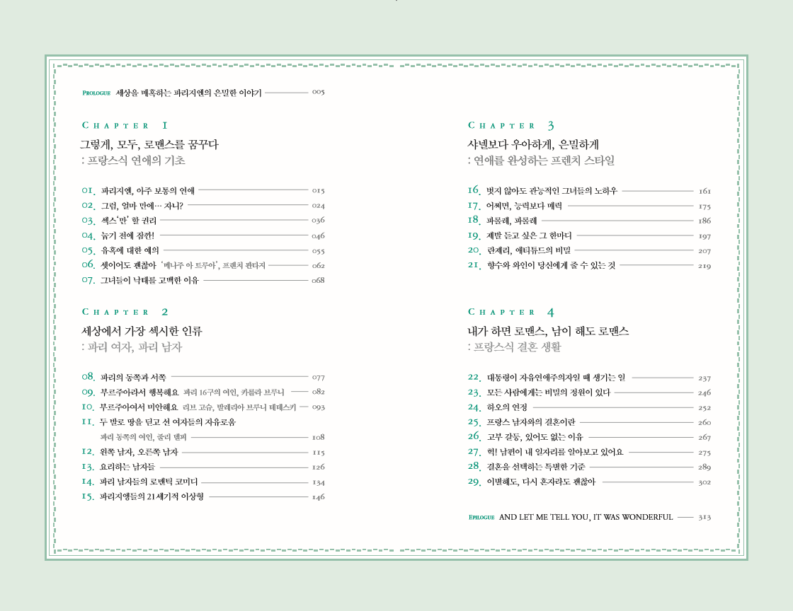2부에서는 파리에 사는 남녀들의 고민과 가치관, 라이프스타일을 구체적인 인물들과 함께 소개하고요, 3부에서는 세계가 이야기하는 "프렌치 스타일"이란 무엇인지, 파리지엔들을 유명하게 만든 그 매력의 실체는 무엇인지, 프랑스 사람들과 일하고 지내왔던 경험과 사회적 이슈 등을 통해 살펴보았습니다. 4부에서는 프랑스인들의 연애관, 결혼관, 인생관과 이를 지탱하는 사회적 시스템을 함께 살펴보았습니다.