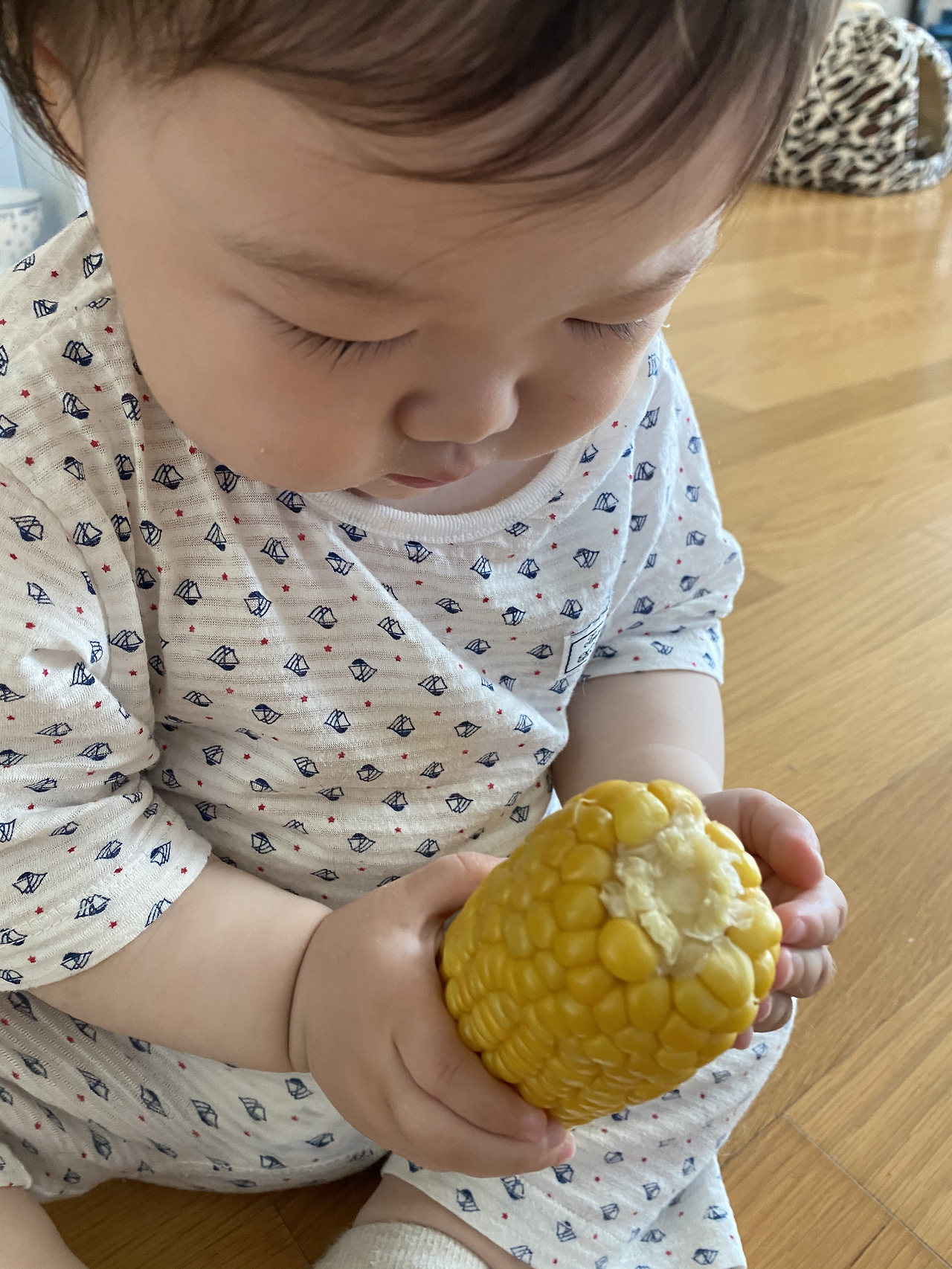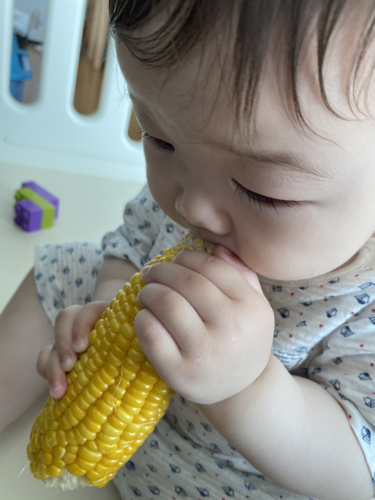 아윤이에게 아가 얼굴보다 길쭉한 옥수수를 건넨다. 조몰락조몰락 요리조리 살피더니 이내 입으로 직행이다. 그건 놀랄 일이 아니다. 프로이트는 이미 80년도 전에 작고했지만 그가 남긴 '구강기'는 여전히 모든 아기들에게 진행 중이기 때문이다. 두 손으로는 옥수수를 고정하고 여덟 개 난 하얀 이로 옥수수 끝을 문다.