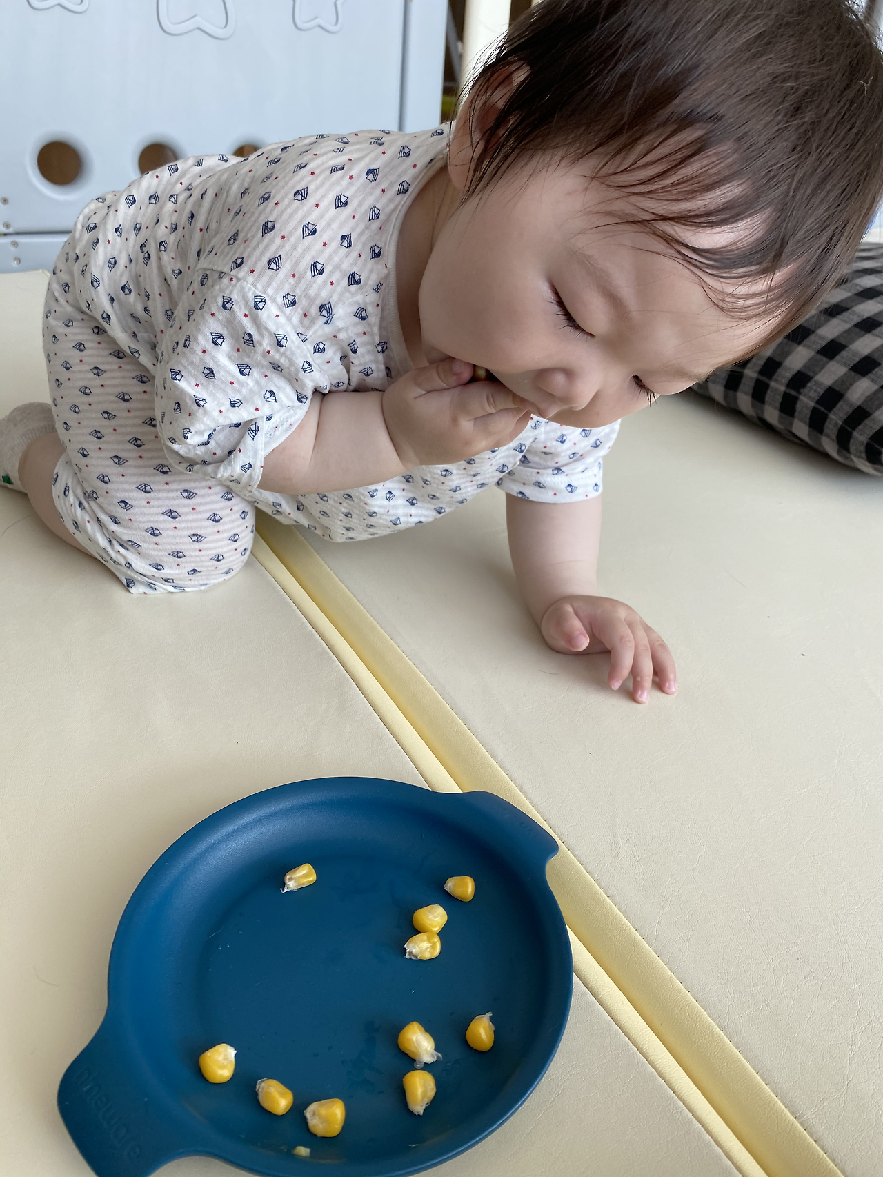 결국 혼잡을 버티지 못한 옥수수 알갱이들이 후두둑, 아가 입에서 우수수 떨어져 내린다.