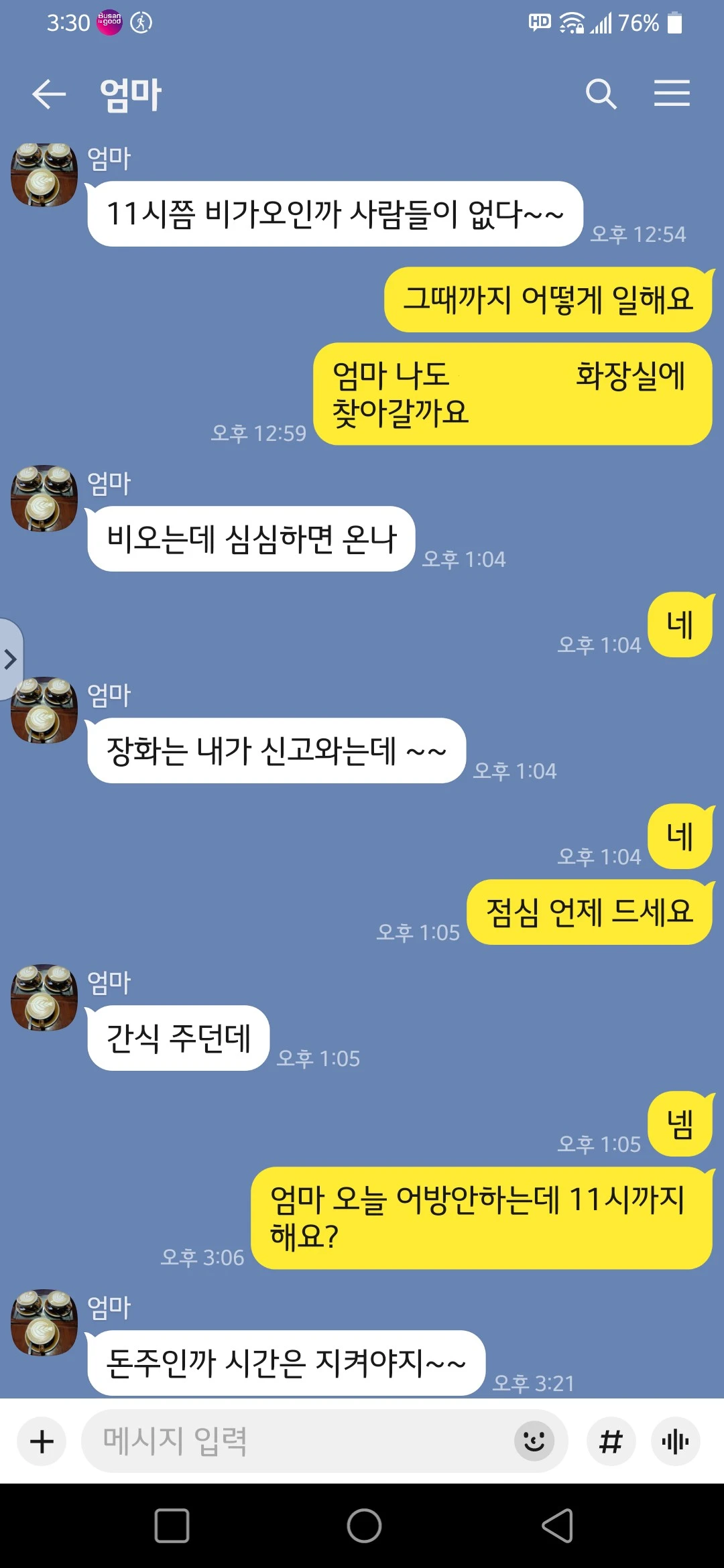 혹시나해서 비가오지만 일하러 간 엄마한테 카톡을 했다. 점심은 어떻게 하며 몇시에 퇴근하는지 물어봤다. 마침 동생은 아침 겸 점심을 중식으로 정해서 밥을 가지러 바깥을 나가게 되었다. 엄마한테 일터에 찾아가도 되냐고 물었고 엄마는 오라고 얘기했다. 동생과 중국집까지 같이 가다가 음식을 받아 집으로 돌아올 때 나는 비바랍을 맞으며 엄마가 일하는 곳까지 걸어갔다. 역시나 엄마는 대걸레로 화장실 바닥을 닦고 계셨다. 엄마는 나를 보자 반가운 듯 했다. 아 찾아가길 잘했다싶었다. 그러나 나더러 여자화장실의 맨 끝칸에 들어가면 앉을 자리가 있으니 잠시 앉아 있으라고 하고는 다른 곳에 청소를 마처하러 갔다. 잠시 후 돌아와서는 얼른 집에 가라고 했다. 그리고 가방에 오늘 받은 3일치 간식을 싸가지고 집에 가라고 했다. 점심식사가 아니라 구청에서(?) 3일동안의 간식을 몰아서 준 거였다. 나는 가방에 다 들어가지도 않는 그 간식을 2개는 가방에 짊어지고 1개는 봉지채로 손에 들고 빗속을 걸어 집에 왔다.