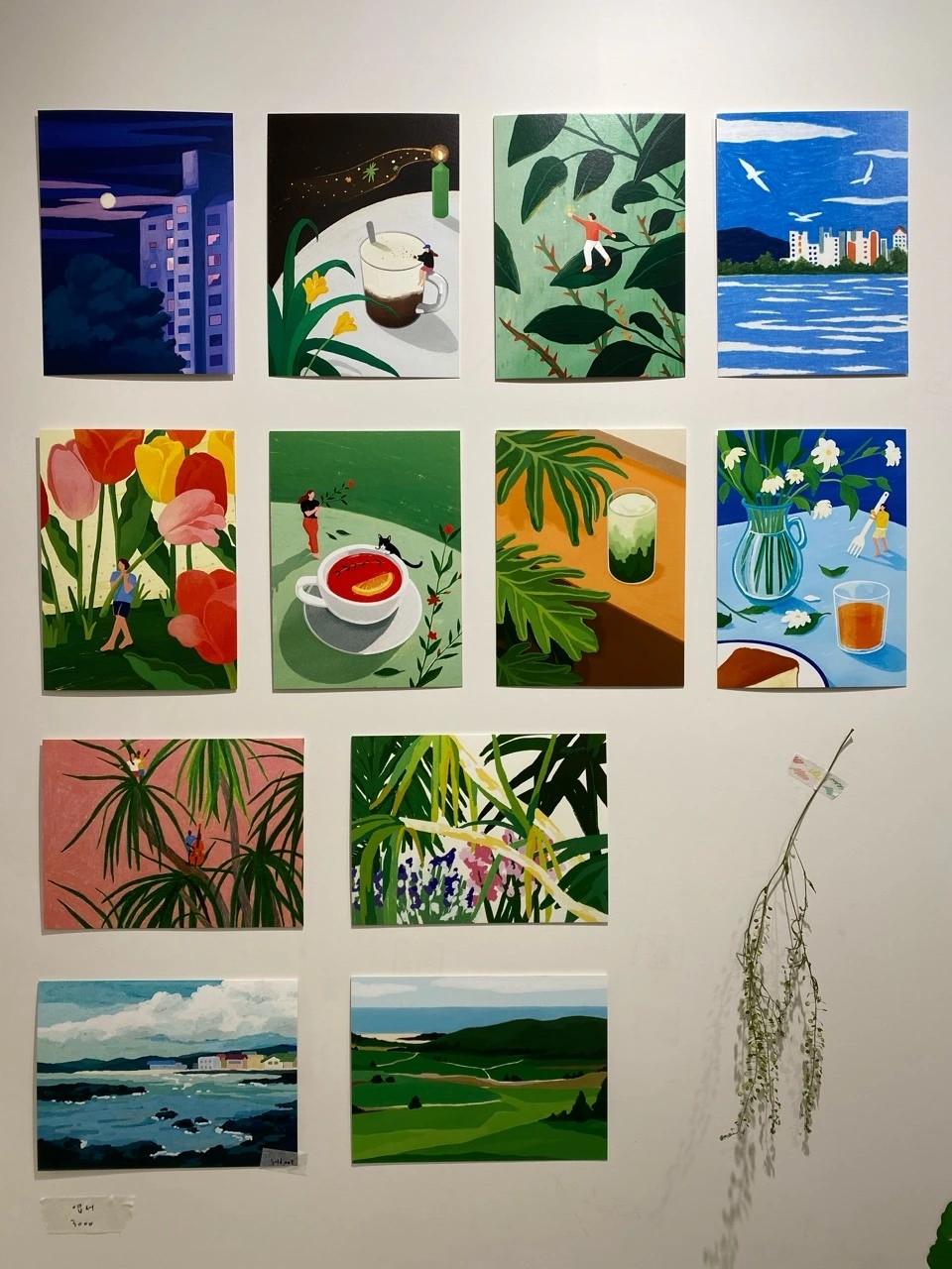 밥을 먹고 곧바로 미술전시장으로 이동했다. 식사 후 곧바로 움직이다 보니 전시회장에 도착한 시간이 점심시간에 걸쳐져 있었는데, 갤러리 관계자의 배려로 기다리지 않고 바로 입장할 수 있었다. 식물과 하늘과 바다에 초점을 맞추고 사람은 상대적으로 작게 표현한 그림들이 평화롭고 잔잔하면서도 뭔가 생동감이 느껴지고 다이내믹하게도 다가왔다. 전체적으로 초록초록하고 파랑파랑한 그림들이 청량하고 아름다워서 그림 앞에 서서 멍하니 무상무념 상태가 되어 바라보고 있자니 숨겨둔 감수성을 불러와 잔잔하게 스며들 듯 힐링이 되었다. 특히 그날의 감성을 솔직하게 써놓은 일기 같기도 하고, 마치 낙서 같기도 한, 화가님이 그림 작업을 하면서 그때그때 일어나는 감정들을 끄적여 놓았다고 하는 메모 같은 단상들이 중간중간 첨부되어 있었는데, 찬찬히 읽어보니 작가의 마음을 좀 더 가까이 느낄 수 있었다. 평소 뭘 끄적거리는 걸 즐기는 나는 작가의 친필 메모들이 그림을 보는 것 이상으로 좋았기에, 방명록에도 그 조각조각의 글들에서 느낀 호감에 대해 감상평을 정성스레 남겼다. 그림들이 크기도 아기자기하고 그림 속 풍경도 다양했는데, 이미 판매 완료되었거나 현재 판매 중인 작품들이 섞여 있었다. 젊은 화가가 작품 활동을 하면서 배고픈 예술가가 되지 않을 수 있도록 그림들이 좋은 가격에 많이 팔리면 좋겠다는 생각이 들었다.