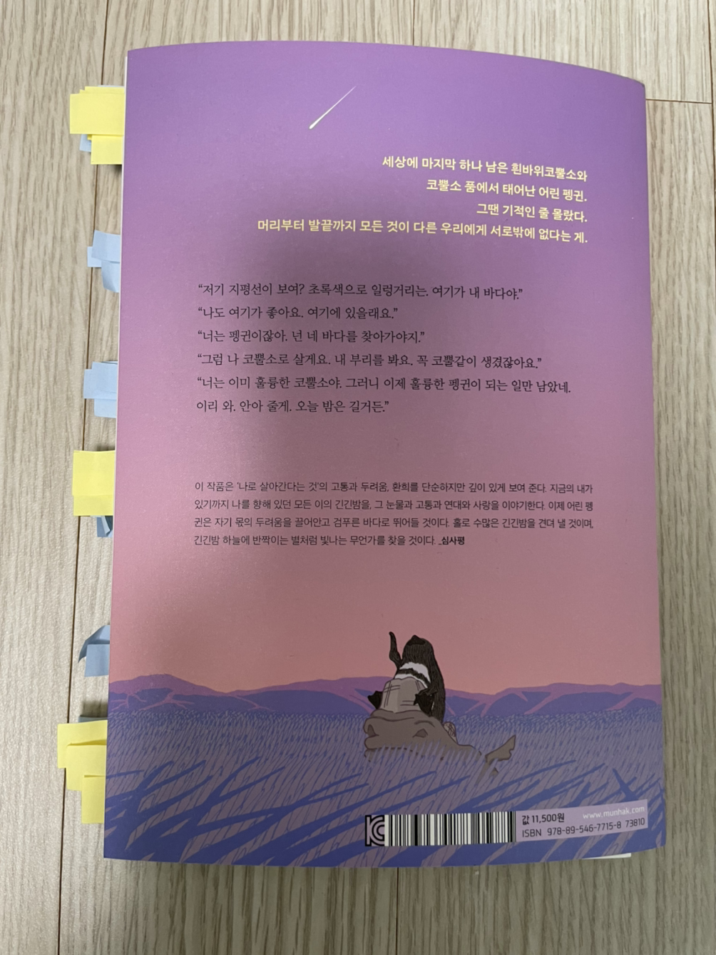 이제 어린 펭귄은 자기 몫의 두려움을 끌어안고 바닷속으로 뛰어들 것이다. 홀로 수많은 긴긴밤을 견뎌 낼 것이며, 긴긴밤 하늘에 반짝이는 별처럼 빛나는 무언가를 찾을 것이다.