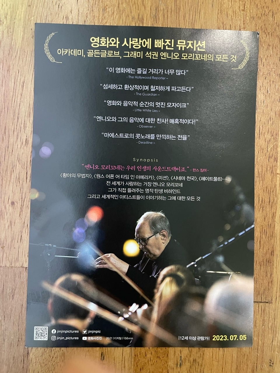 두 시간 반이 넘는 긴 러닝타임이 순삭되는 느낌이었다. 엔니오의 영화음악이 삽입된 수많은 영화들과 ost들을 한 번에 집대성해 놓은 이 다큐를 보니, 그 시절 그 순간으로 되돌아가듯 깊은 상념과 그리움이 밀려드는 기분이었다.