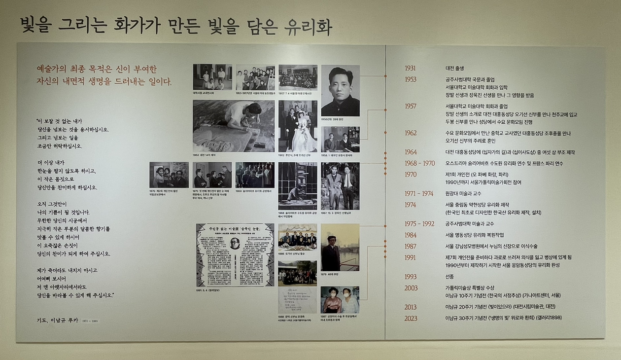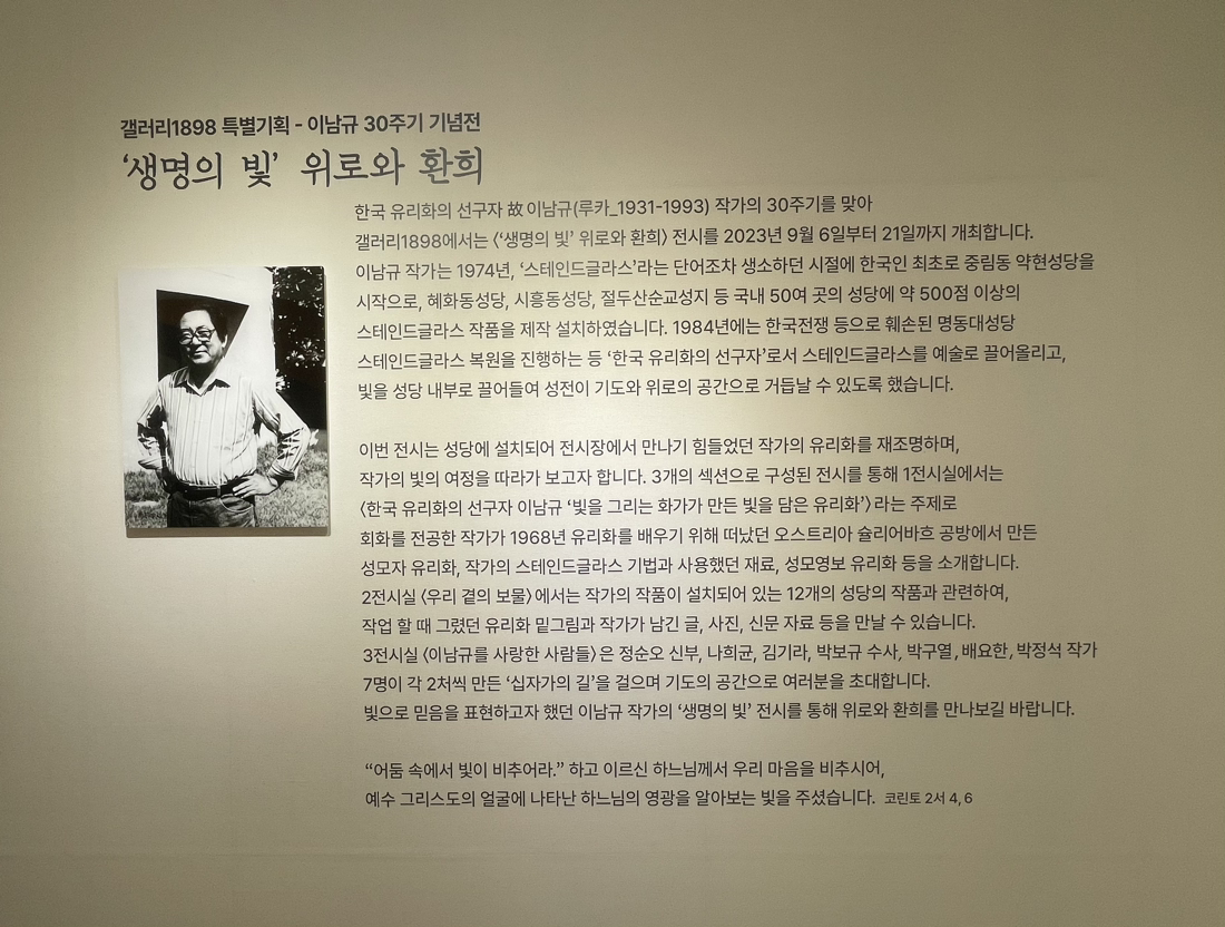 이 전시는 성당 건축의 상징인 유리화, 즉 ‘스테인드 글라스’ 작업에 있어서 우리나라에서는 선구자였던 ‘고 이남규(루가)’ 선생님이 작고하신 지 30주년을 기념하여 열린 특별기획전이라고 합니다.
