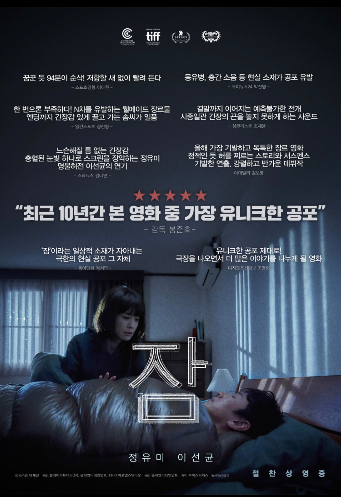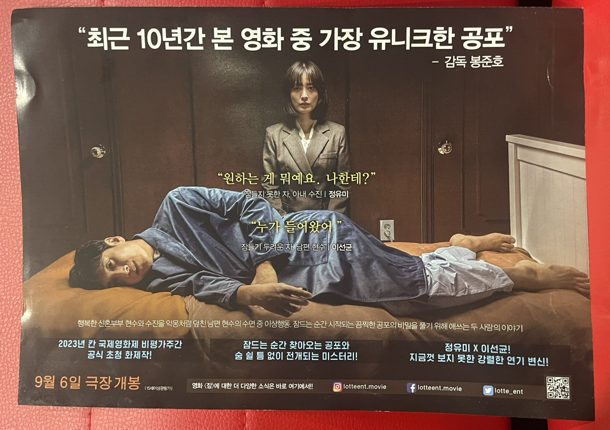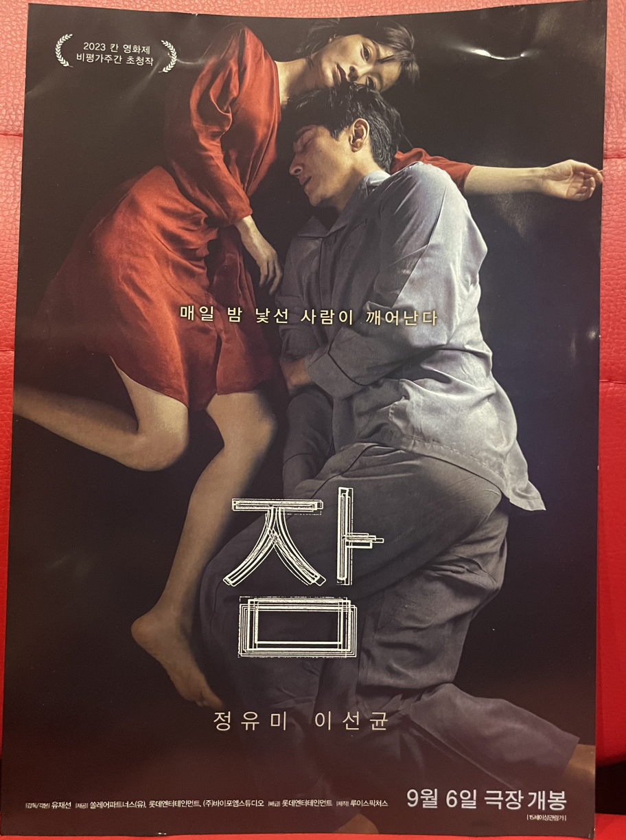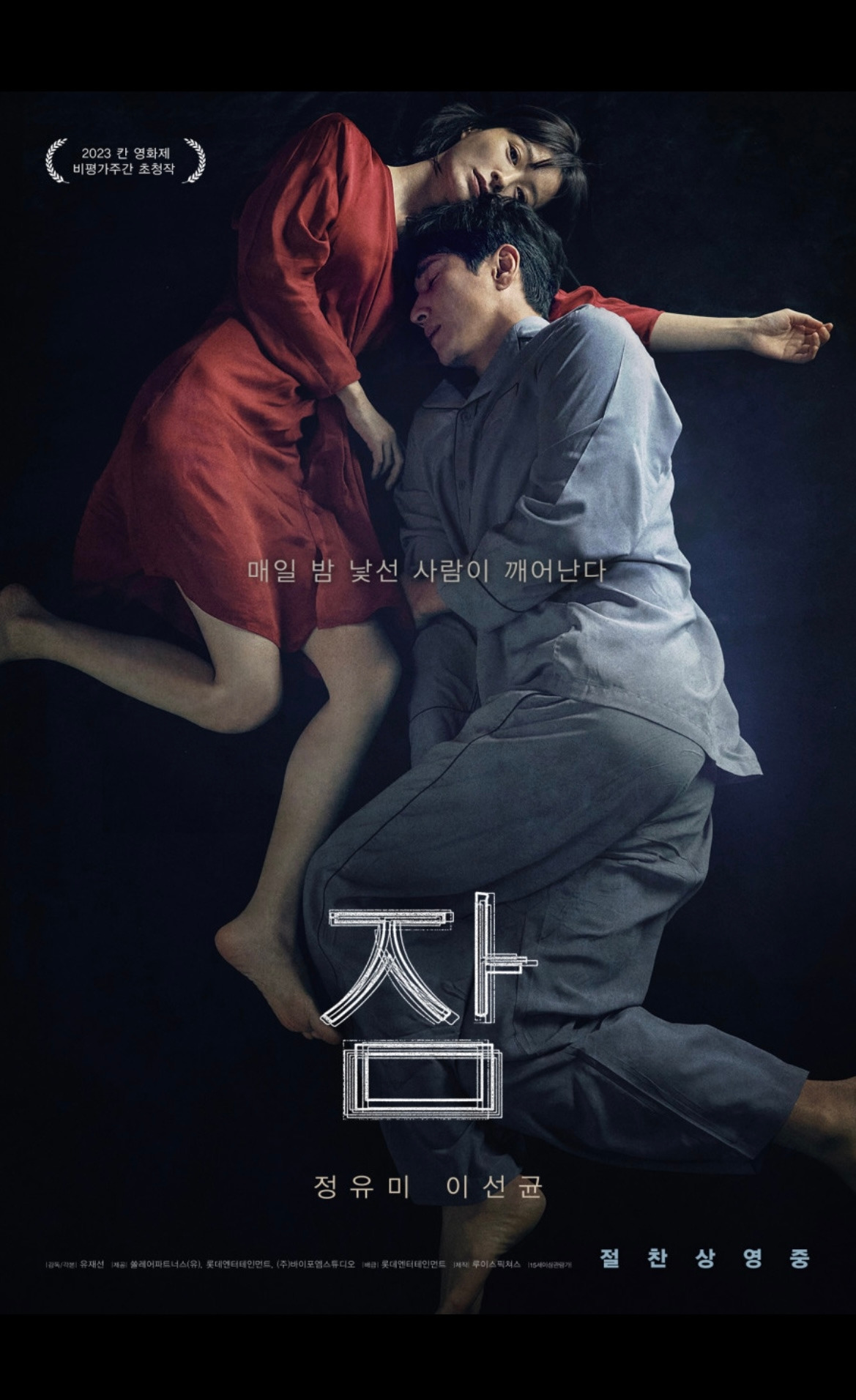 이 영화는 제목에서 알 수 있듯이 ‘잠’을 소재로 한 영화일 거라는 짐작은 할 수 있었다. 갱년기 증상의 일환인지 수면의 질이 들쭉날쭉하는 요즘의 내 컨디션 때문인지 ‘잠’을 모티브로 하여 어떤 스토리를 풀어냈을까 하는 호기심을 안고서 영화를 보러 갔다. 영화 관람 전에 영화에 대한 사전 정보가 별로 없는 상태에서 보는 것이 좀 더 몰입할 수 있었다는 경험이 많아서이기도 했지만, 실은 좀 바빠서 영화에 대해 검색해 보지 못하고 갔다. 때문에 영화를 보러 가기 전에는 인지도 있는 두 배우가 주연이라는 것 이외에는 이 영화에 대해 별로 알고 있는 것이 없었다. 단지 미스터리 공포영화라는 것은 잘 알고 있었는데, 개인적으로는 오싹해지는 잔상이 오래 남는 공포물이나 답을 몰라 답답한 미스터리를 별로 좋아하는 편이 아니라서 혹시 너무 무서우면 어쩌나 하는 소심한 걱정은 좀 있었다.