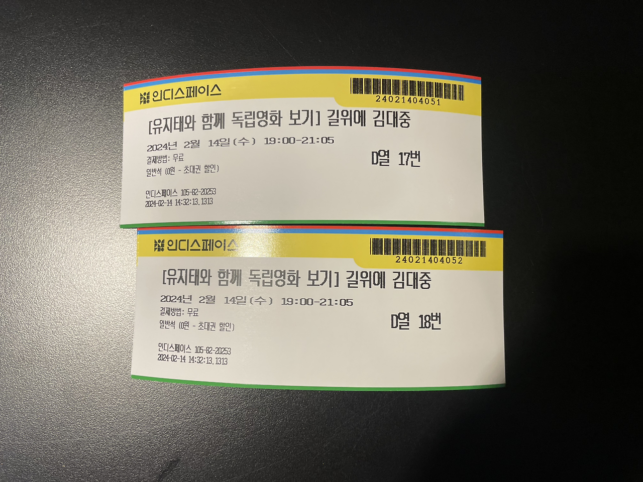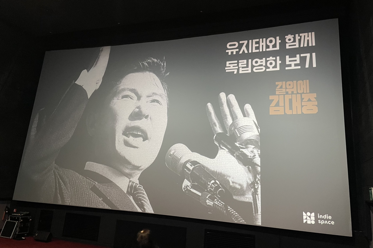 안그래도 평소 사심 어린 호감과 팬심 가득 갖고 있던 유지태 배우가 상영관을 통째로 대관하여 응모자들 중 선별된 관람객들을 초대하여 <길위에 김대중>을 함께 관람하는 의미로운 자리를 마련하였다는 것에 반갑고 고마운 마음이 올라왔다. 잠시도 고민할 여지 없이 곧바로 응모 양식에 맞게 개인정보를 작성하여 전송을 하긴 하였는데, 여지껏 살아오면서 무엇이 되었든 노력 없이 공짜로 얻어본 경험이 전무하다시피 한 나로서는 조금의 기대도 하지 않은 마음이었다. 그렇게 응모한 것을 잊어버리고 있을 무렵 뜻밖의 문자메시지가 하나 날아들었다. 내가 응모한 신청서가 채택되어 [유지태 배우와 함께 독립영화 보기] : 다큐영화 <길위에 김대중> 관람 초대장을 받게 된 것이었다. 살다 보니 나에게도 이런 행운도 오는구나 싶었고 신기하기만 했다. 기분이 붕 들떠서 설레이고 기쁜 마음으로 영화관을 향해 달려갔고, 유지태 배우를 근거리에서 만났고, 여러 관람객들과 함께 이 영화를 보게 되었다.