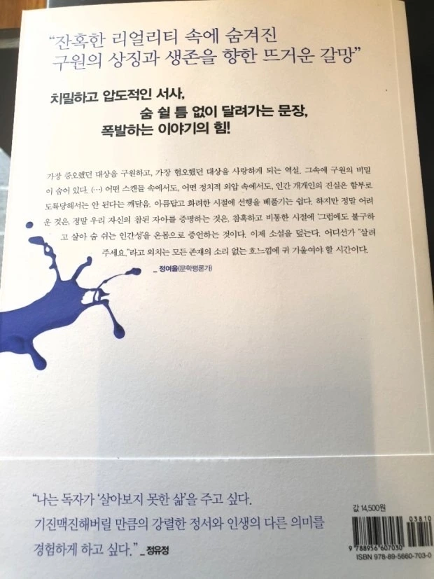 하지만 소설 전개와 표현방식이 너무도 직설적이어서 책을 읽다가도 중간중간 책을 덮고 싶었던 순간이 여러 번 있었을 만큼 흠칫 놀라기도 했으며, 책을 완독하고 난 후에는 한마디로 '이 책 참 독하다'라는 느낌이 훅 올라왔을 만큼 나의 개인적인 선호 코드와는 잘 맞지 않았던 책이었기에 2점을 차감했다. 그러면서도 어쩌면 차마 직면하기 힘들 만큼 불편한 진실이라서 무의식적으로 작용하는 비겁한 방어기제일런지도 모르겠다는 자성도 해보게 된다.