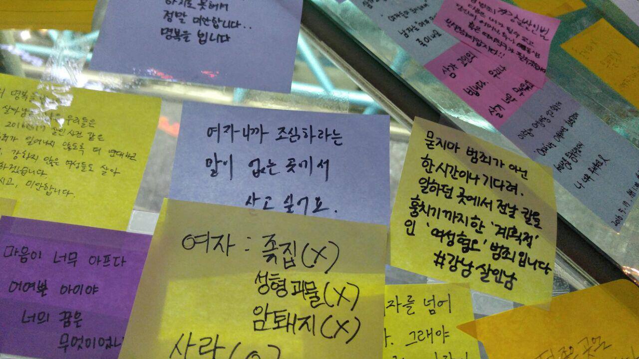 사실 그동안도 여성이 살해당한 사건은 너무나도 많다. 하지만 이 사건 자체가 방아쇠가 된 것은 언제나 여성들은 살해당해 왔지만 '강남', '번화가', '공개된 화장실', '남자친구와 동행' 등등 이 사건이 품고 있는 많은 요소들이 대부분의 여성들이 느끼고 있던 불안감 혹은 젠더의식을 촉발시키는 계기가 된 것 같다. 나는 이번 사건을 통해 내 가족 혹은 애인, 지인을 걱정했지만 여성들은 그들 자신의 생이 달린 문제로 느끼고 있다. 이건 남성의 잘못이다 아니다 이런 차원이 아니라 남성이기때문에 절대 알 수 없는 지점일 것이다. (물론 남성도 살해를 당하고 사회적 공포에 시달리지만 통계나 확률을 봐도 여성의 공포감과는 너무나도 다를 것이다) 언론 역시 사람들의 공포심만 자극한다기보단 여성들의 공포를 드디어 담아내기 시작했다고 본다.