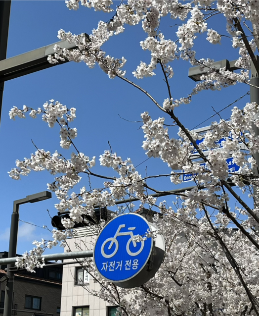 세 해 째, 벚꽃이 핀 동네길을 걸으며 가장 좋아하는 사진 명소를 만들었다. 평소에는 잘 보이지 않다가 유독 이때에만 저 파란 동그라미가 그리도 마음에 들어온다. 이유는 모른다.