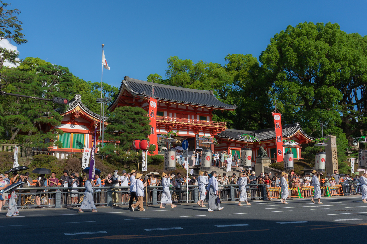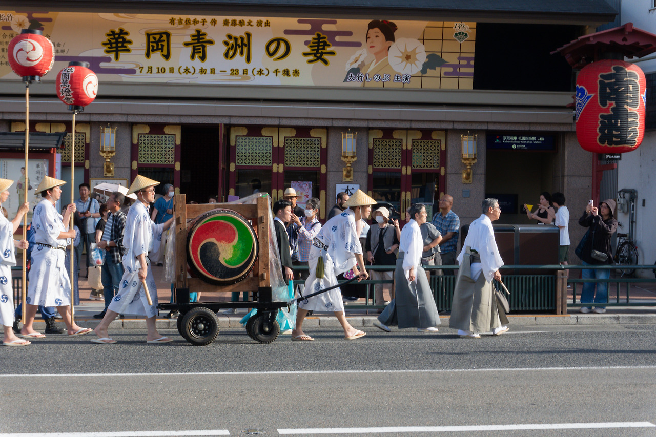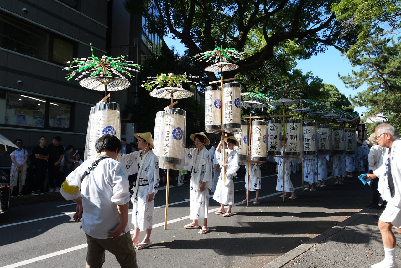 상점가를 벗어나면서 중심가로 이동하는데 긴 행렬이 늘어서 있고 사람들이 많이 모여 있어서 뭐 하는 건가 하고 봤더니 계획 세웠을 때 상황 봐서 볼 수 있으면 보자 했던 기온마츠리 행렬이었다. 럭키비키! 기온마츠리의 시작 행사로 신을 모시는 가마를 가모강으로 가져가 씻기고 다시 가져오는 행렬이었다. 긴 행렬 때문에 시내 교통을 통제하고 악기 소리와 함께 다양한 분장을 한 어린이들과 어른들의 행렬이 이어졌다. 운 좋게 좋은 구경!