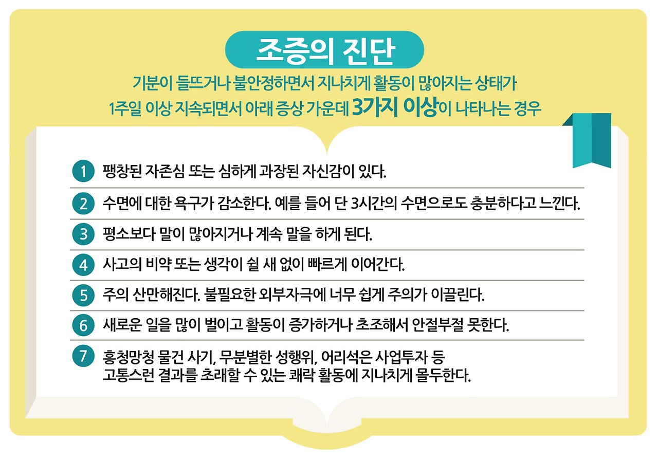 조울증 증상 중 하나인 조증은 기분이 비정상적으로 고양되어 충동적이고 폭력적인 행동이나 논리적 비약 등의 행동을 보이는 정신적 상태를 지칭한다. 조증 시기에는 과도한 흥분, 고양, 불안, 불면, 과대망상 등의 증상을 보인다. 반대로 우울증 시기에는 심각한 우울감, 무기력, 자책감, 수면장애, 피해망상 등이 나타난다. 조울증은 조증과 울증이 번갈아 나타나면서 몸의 에너지가 급변하고, 그에 따라 충동적인 행동을 할 수 있기에 일반적인 우울증보다 위험한 질병으로 간주한다. 한 전문의는 단일 질환으로 자살의 위험이 가장 높은 병으로 조울증을 꼽기도 했다. 조울증은 신경 전달 물질, 뇌세포 회로의 활성도, 호르몬 균형 등에 문제가 생기는 뇌 질환으로, 발병이나 악화에 스트레스와 생체주기 변화(수면, 생리 등이 영향을 미친다)가 밀접한 관련을 보인다.