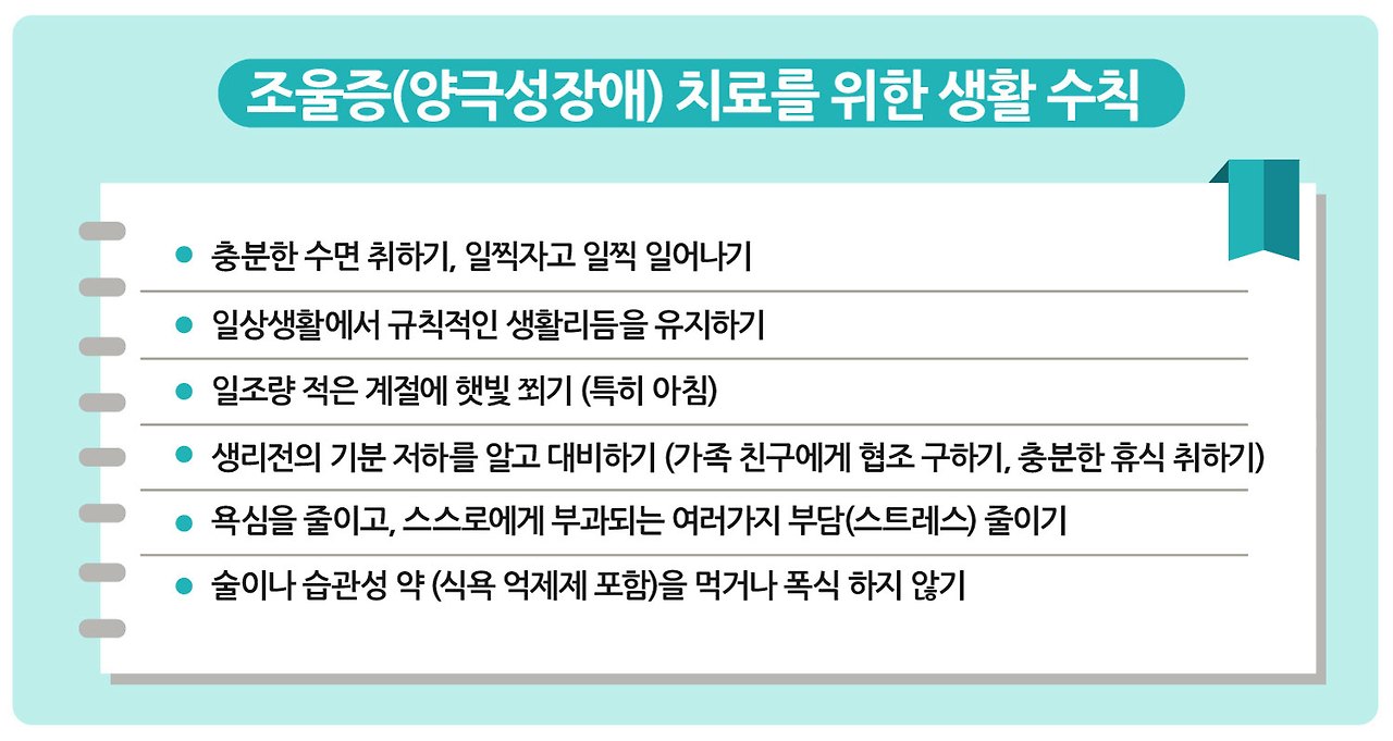 약과 함께, 무리한 음주가 발병에 영향을 끼쳤을 것이다. 당시 나는 할머니의 알츠하이머 진단과 더불어 타인과의 관계 지속 실패로 지독한 우울감을 앓고 있었고, 이를 술의 힘을 빌려 해소하고자 했다. 대부분의 식욕 억제제는 중추 신경계를 지속해서 흥분 시켜 식욕을 억누르고, 에너지 활동을 높여 체중 감량에 도움을 준다. 이와는 반대로, 술은 중추 신경계의 주요 기능을 억제한다. 식욕 억제제와 술은 담배와 술의 관계와 마찬가지로 그 작용에 있어 대립점에 있다. 따라서 둘을 함께 섭취하면 부작용이 나타날 수밖에 없는데, 나는 이를 간과하고 내 기분에 따라 술을 마셨다. 술을 마시면 몸이 가라앉으면서 기분은 좋아지는 느낌에 어쩌면 중독되어 있었던 것도 같다. 아래 그림을 통해 조울증 치료 수칙에 '술과 식욕 억제제 등의 약을 먹지 않는다'는 항목이 들어가 있음을 확인할 수 있다. 나는 이와는 정반대로 행동했고, 스트레스를 조절하는 법을 몰라 술에만 의존했다. 늦은 시각까지 술을 먹다 보니 수면의 질도 떨어졌다. 병을 스스로 유발한 것이나 다름없다.