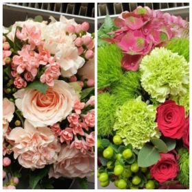 장미와 카네이션, 하이페리콤을 기본으로 조합하였으나 색상 조합에 따라 시선을 끄는 정도가 다르다.