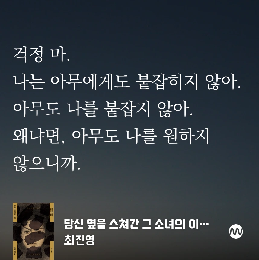 저 소녀를 끝까지 데려갈 어른이 단 한 명이라도 있었더라면... 소녀가 저렇게까지 부서지지는 않았을 텐데..라는 생각이 들었습니다. 어쩌면 저렇게 부서지는 사람이 '과거의 나' 였을 수도 있다고 생각하니 이 책은 픽션이 아니라 다큐 같았습니다.