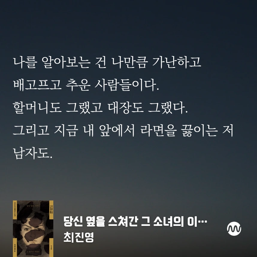 마지막으로 저는 읽는 내내 슬프고도 감사했습니다. 까딱하면 나도 저 이름 없는 소녀처럼 될 수도 있지 않았을까라는 생각과 더불어 내가 이름 없는 소녀처럼 되지 않아 정말 다행이라는 생각이 얼기설기 섞여 제 안에 떠돌았습니다.