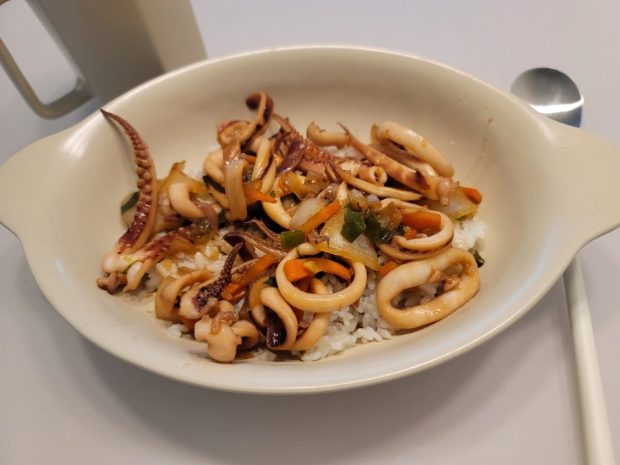 밥을 담고 오징어를 밥 위에 솔솔 올려놓으니 꽤 그럴싸했다. 맛도 괜찮았다.
