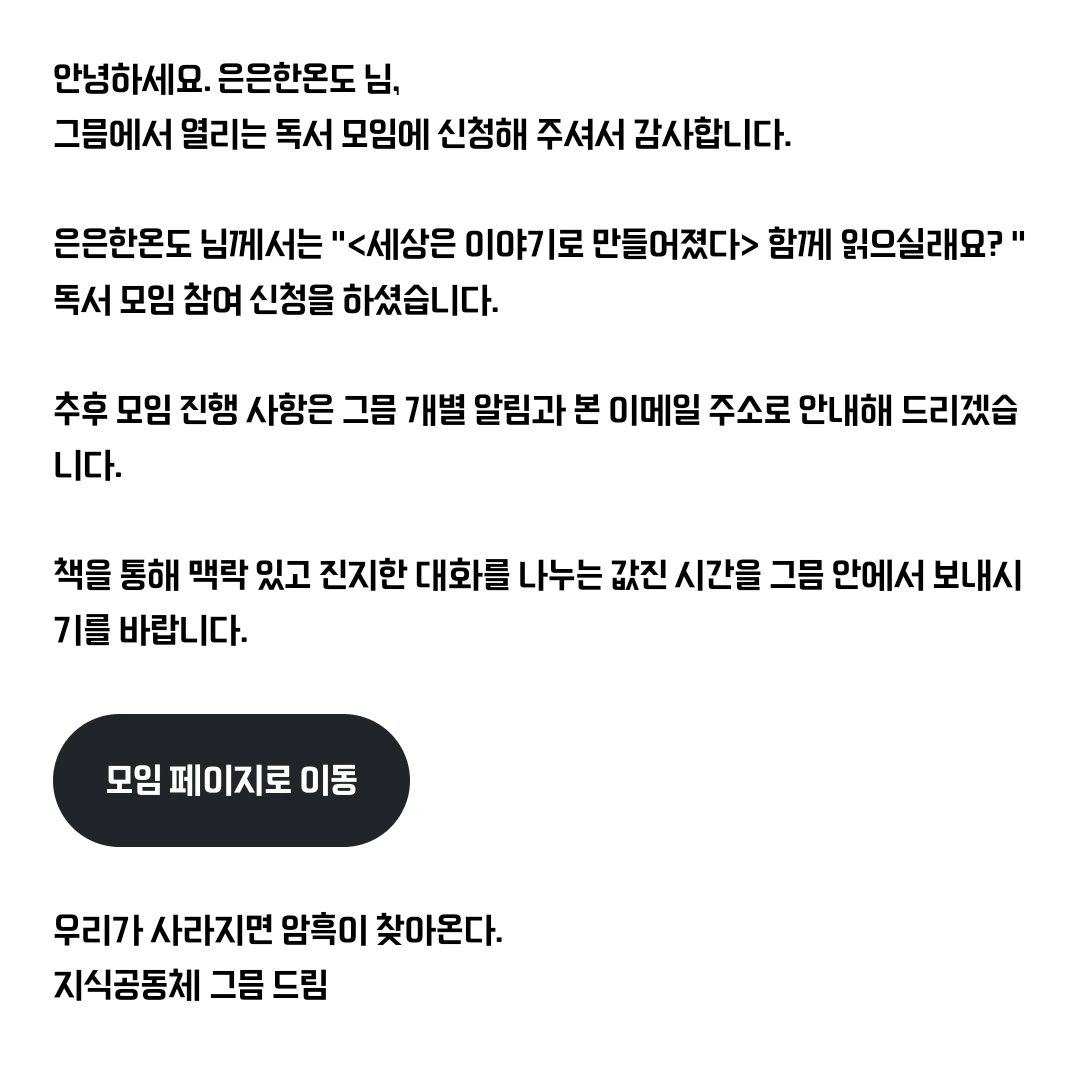 3. 집단 무의식 이용하기 : 글쓰기 모임이나 책 완성 모임 등에도 참여하기. 현재 제가 재밌게 읽었던 책의 작가님이 직접 주최하는 책 읽기 모임에 참석신청을 해 놓은 상황입니다.