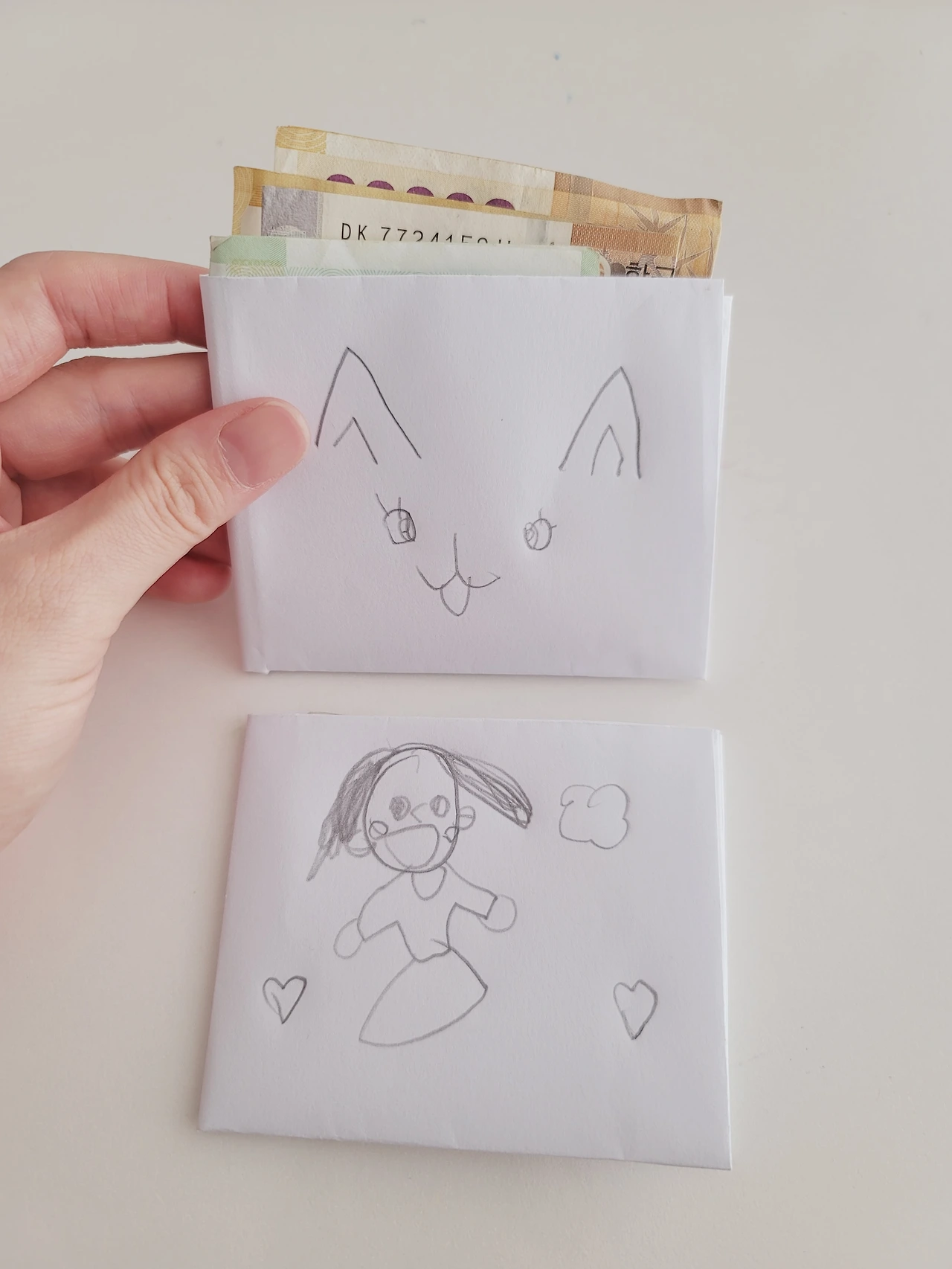 딸은 혼자 영상을 보며 멈췄다가 다시 틀었다가 접었다가 폈다가 오리고 붙이고를 하더니 지갑을 완성했습니다. 그리고 자기 지갑에 있는 전 재산을 털어 동생 지갑에 넣어주었습니다.