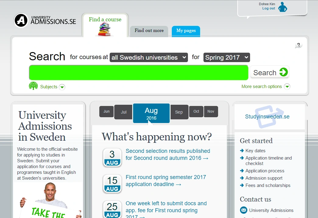 나는 KTR 장학금 라운드에 도전하면서 대학원 진학을 준비했기에, KTR에서 요구하는 퀴즈를 풀고 에세이를 작성해야했다. 따라서 이에 필요한 공부를 하고, 에세이 주제를 고른다음 자료 조사와 인터뷰 계획을 짰다. 이와 달리, 자비 유학의 경우에는 특정 장학금 프로그램에 지원하지 않는 이상 나와 같은 준비를 할 필요는 없다. 다만 가장 중요한 것은 스웨덴 내 전체 대학 입학을 관리하는 Universityadmisson.se 에서 자신이 지원하고자하는 코스와 지원 자격을 검색하는 것이다. (물론, 미리 마음에 두고 있다면 훨씬 좋지만!)