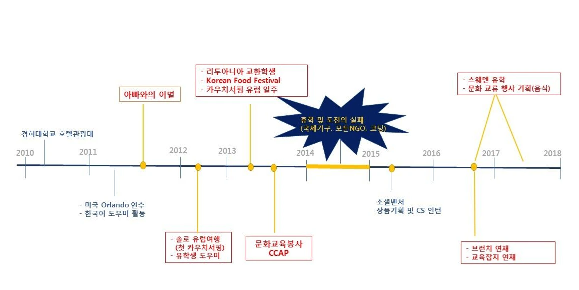 '여행'을 좋아해요 라고 말한다면 그 역시 너무나도 뻔한 주제일 것이다. 이 세상에 '여행'에 미친 사람들이 얼마나 많은가? 그럼에도 불구하고 내가 조금 더 깊이 있는 여행을 하기 위해 노력했다고 말할 수 있는 점은 여행을 할 때마다 단순히 관광객이나 여행객이 아닌 그 지역 주민이 잠시라도 되어보고자 노력했다는 점이다. 나는 매 여행 때마다 여행객과 현지 주민을 연결해주는 '카우치서핑'이라는 웹사이트나 페이스북 커뮤니티를 통해 낯선 외국인 집에서 생활하고자 노력했고, 국내에서도 외국인 친구들과 다문화 봉사를 함께 하며 그들이 세상을 바라보는 방식을 배우고자 노력했고, 나의 세계관을 공유하고자 했다. 마음이 닫힌 친구들을 만날 때나 교류의 기회가 없을 때에는 직접 내가 이벤트를 기획하며 전 세계 친구들을 연결하고자 하는 기회를 만들었다. 리투아니아와 스웨덴에서 문화 교류를 위한 행사를 기획하거나 문화와 관련된 발표에 참가한 경우가 이에 해댱된다. 기회가 없으니, 나 스스로 문화를 공유하고 우리가 좀 더 서로를 이해할 수 있는 소통의 '플랫폼'이 될 수밖에 없었다. 이 일련의 경험들은 교류의 접점을 만드는 것의 중요성과, 내가 먼저 마음을 열고 다가가는 것이 얼마나 중요한지 가르쳐 주었다.